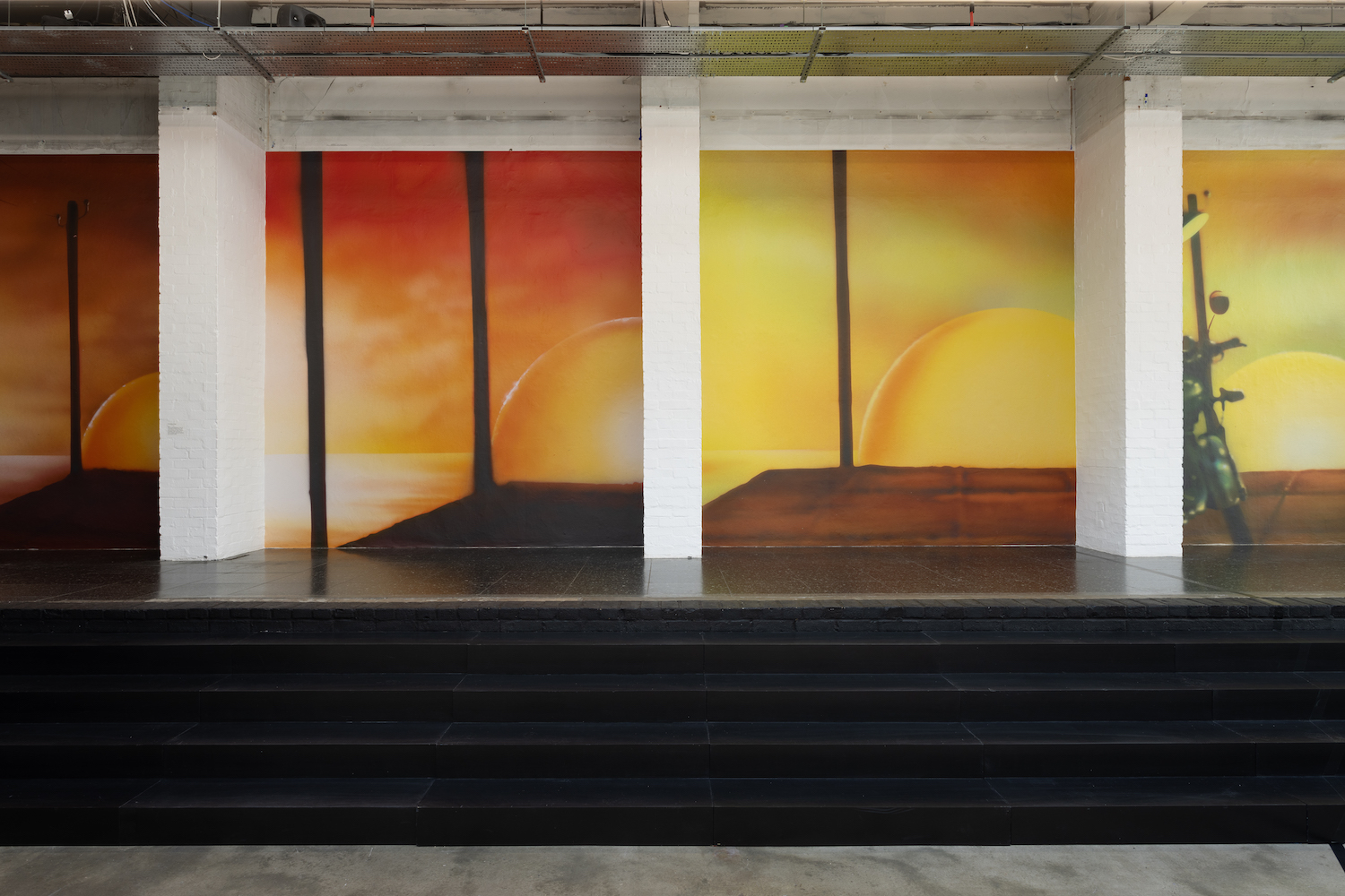 What makes The Red Sun is High, The Blue Low feel more expansive in scope, though, is less its physical scale, and more the zoomed-out abstraction of the power structures in question. This is perhaps most poignantly achieved by the six blurred images of rising suns along the main space’s back wall, each a still from Rainer Werner Fassbinder’s 1982 masterpiece Querelle. Just as the film itself conjures a sense of suspended time – of lacking consequence, of life as a desire-driven dérive towards a tomorrow that may never come – the recurring suns introduce an ambivalence around how the exhibition, and the experience of it, is to be contextualised and understood. Are these suns to be interpreted as a film-strip-like series a single setting sun? Or are we in a world with six of them, a reality that would upend our understanding of the world on a fundamental level, physical level?