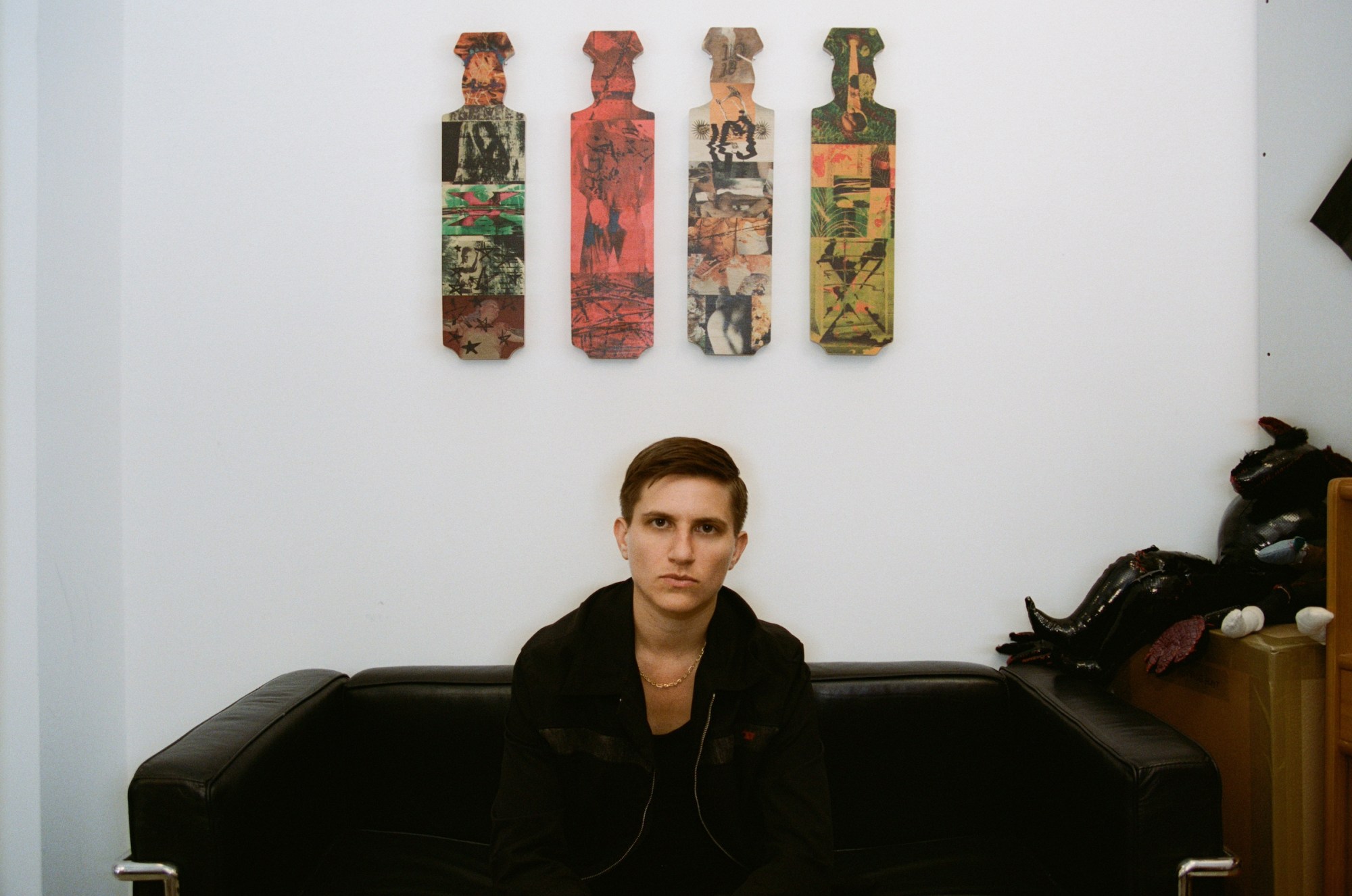 “If you like being dominated or punished — or paddled — there’s still a connotation of violence, but there’s a different relationship to it,” he says, as well as psychosexually charged collages that draw their source material from vintage gay porn and frat magazines.