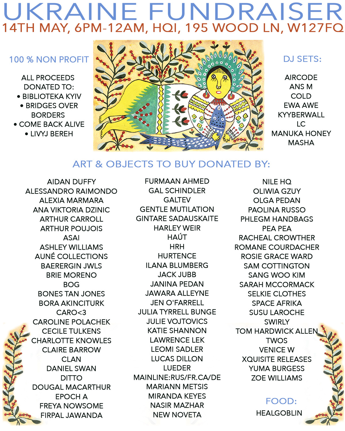 If you’re in London tomorrow, a fundraiser for Ukraine is being held from 6pm until midnight with works donated by some very prolific artists and creatives, and DJ sets from some of the most exciting names in the UK scene at the moment, with all proceeds going to support grassroots organisations. The countries libraries Biblioteka Kiev, international peacekeepers Bridges over Borders, Come Back Alive (who support soldiers with purely defensive initiatives) and humanitarian aid fund Livyj Bereh will all benefit from the sales of items from Harley Weir, Asai, Paolina Russo, Caroline Polachek, Miu Miu, Jawara Alleyne, and many more. To donate directly or buy tickets for the fundraiser in west London, head to the @golubka_4_ukraine Instagram page. TG