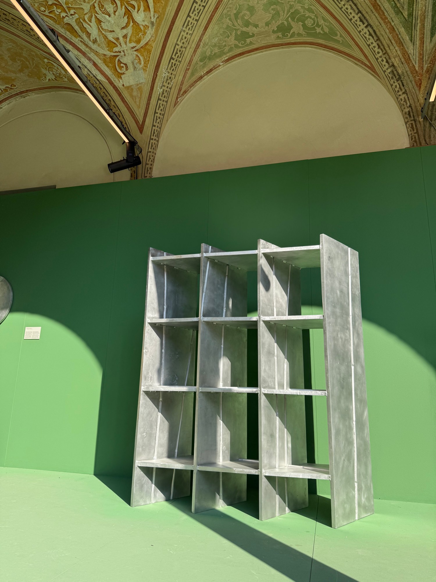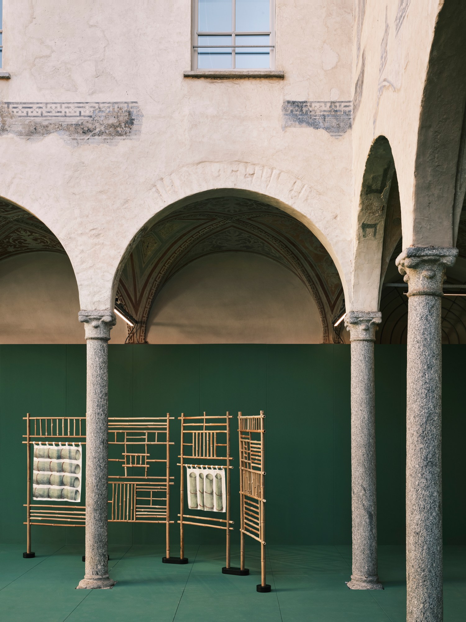 Nathalie Du Pasquier, in full Memphis-mindset, gave us PASSAVENTO: bamboo frames supporting silk curtains printed with giant stalks—delicate and slightly absurd. “Bamboo is a material, not only an image,” she said. “I couldn’t measure its lightness in a painting.” So she built something that moved with the breeze, like a screen with stage fright. It didn’t hide anything—it hinted.