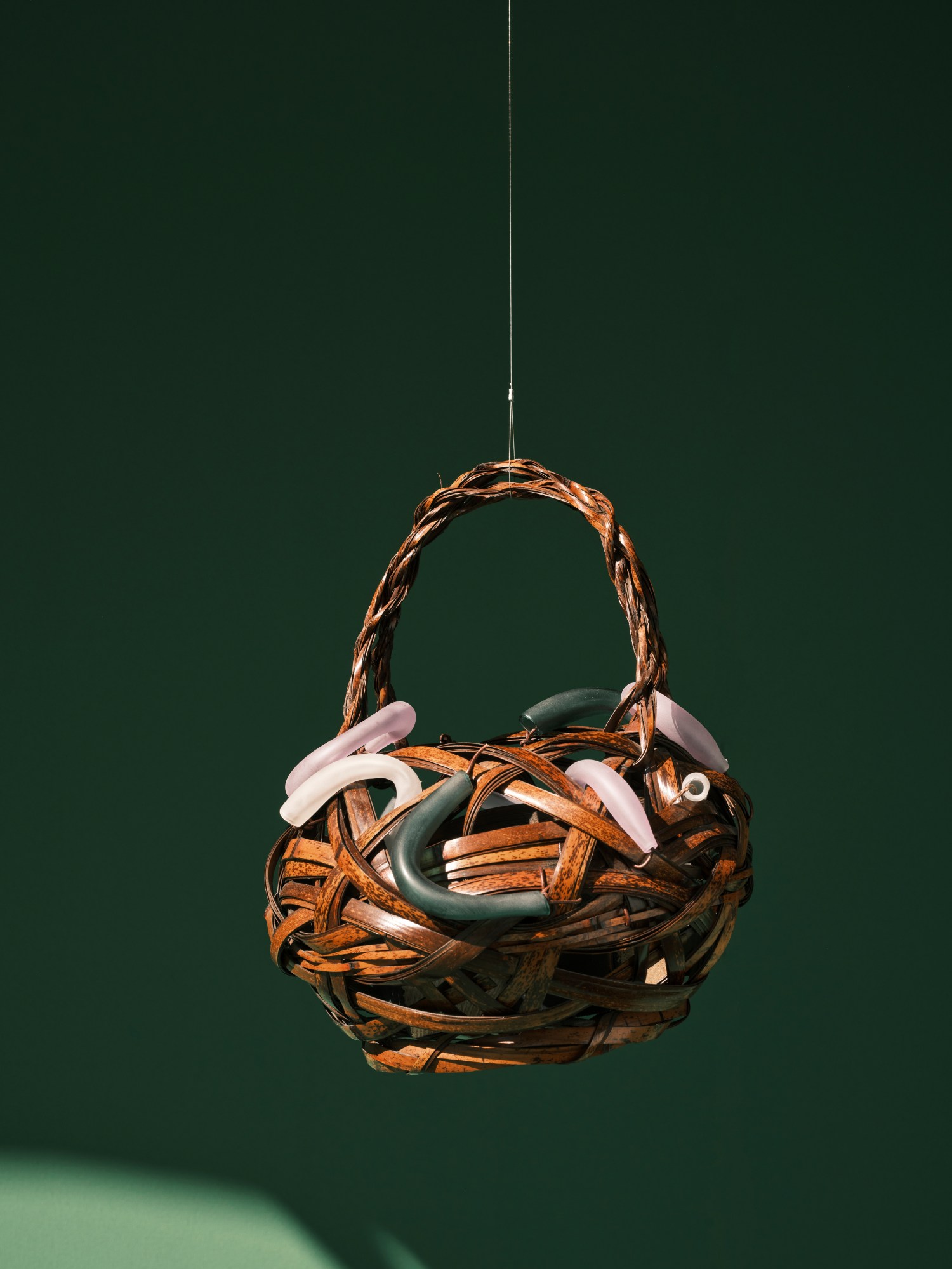 Dima Srouji’s Hybrid Exhalations took found bamboo baskets—some joyful, some weighted with colonial subtext—and fused them with hand-blown glass, made by Palestinian artisans. “Rather than rewriting history,” she said, “I’m engaging with the rich materials and bringing out elements that are commonly invisible.” One of the baskets, she pointed out, was a WWII hat from an English gentleman’s collection. Another? An egg basket. “There’s joy and colonial legacy in the same breath,” she added. “Centering the periphery is part of the fun.”