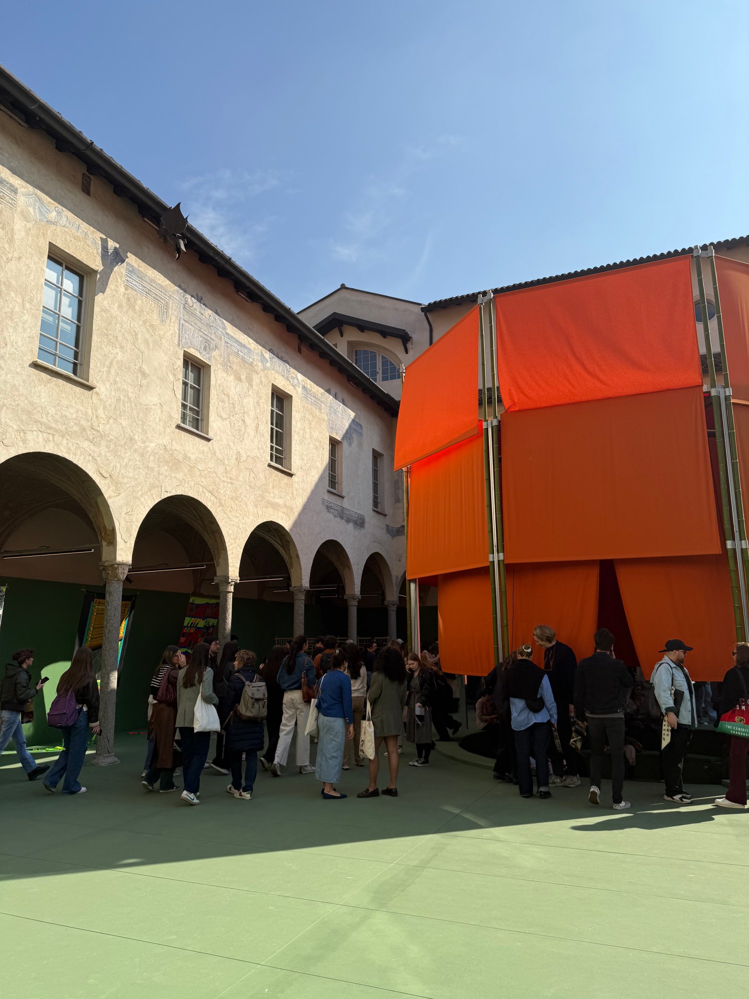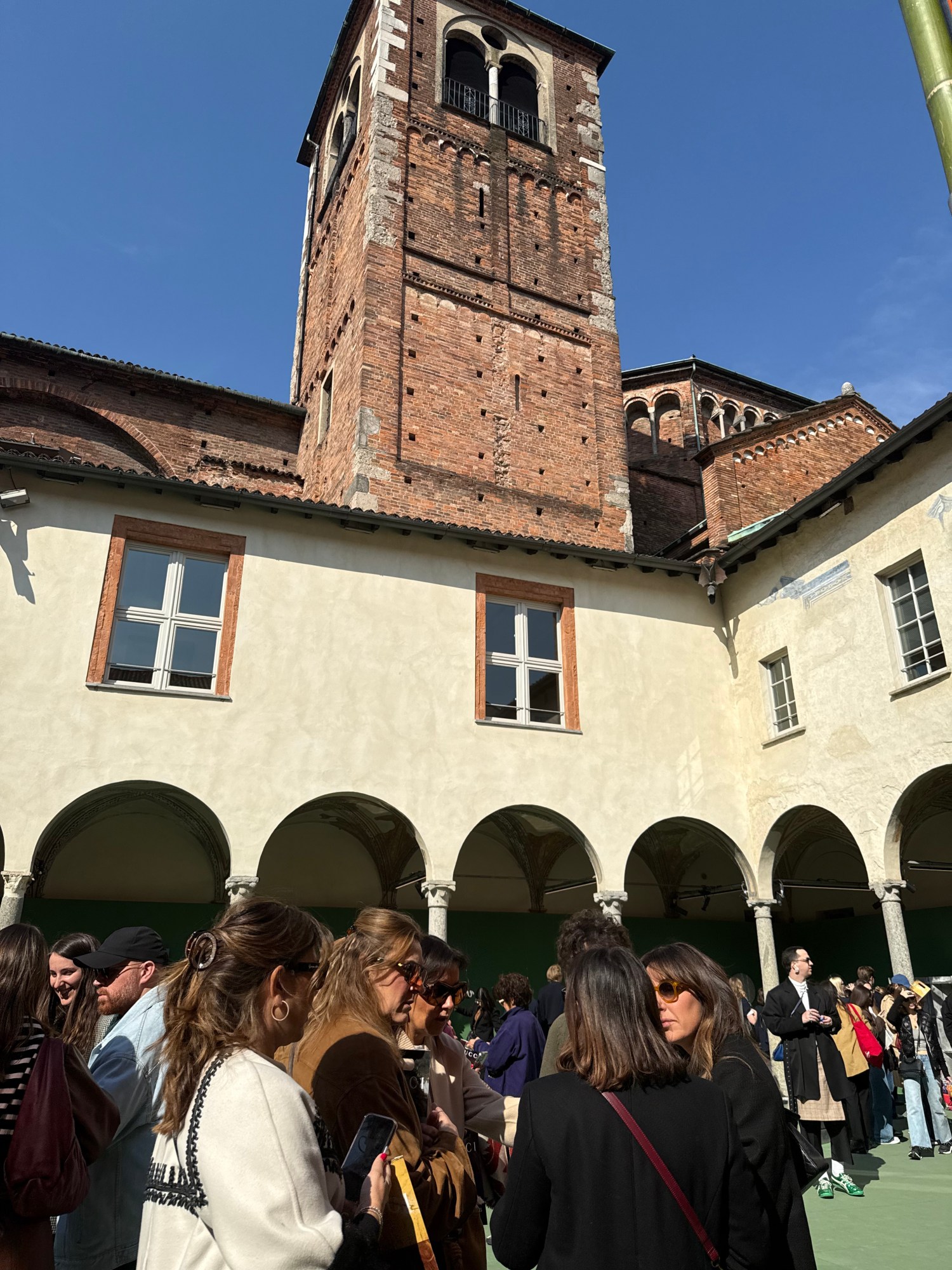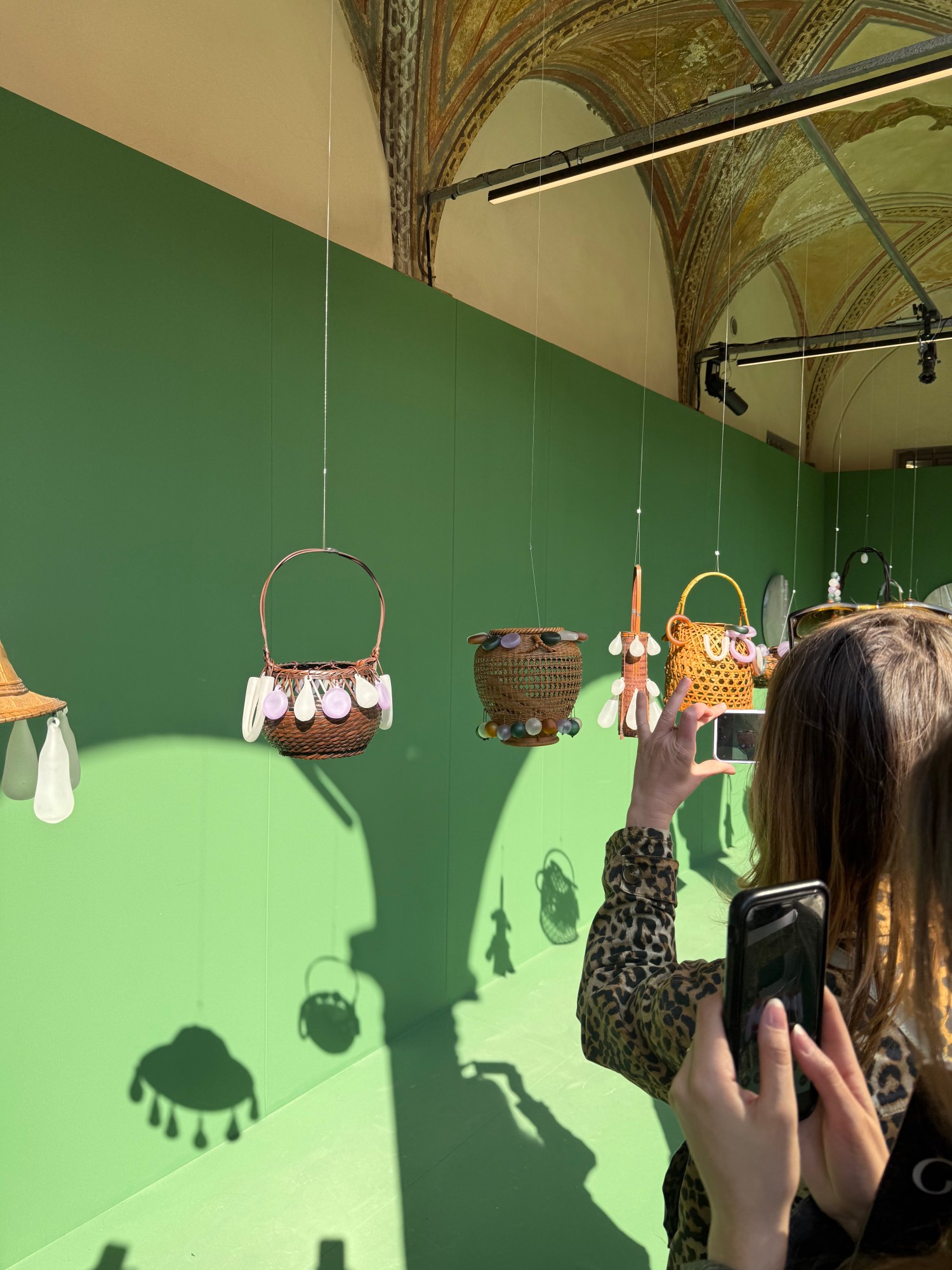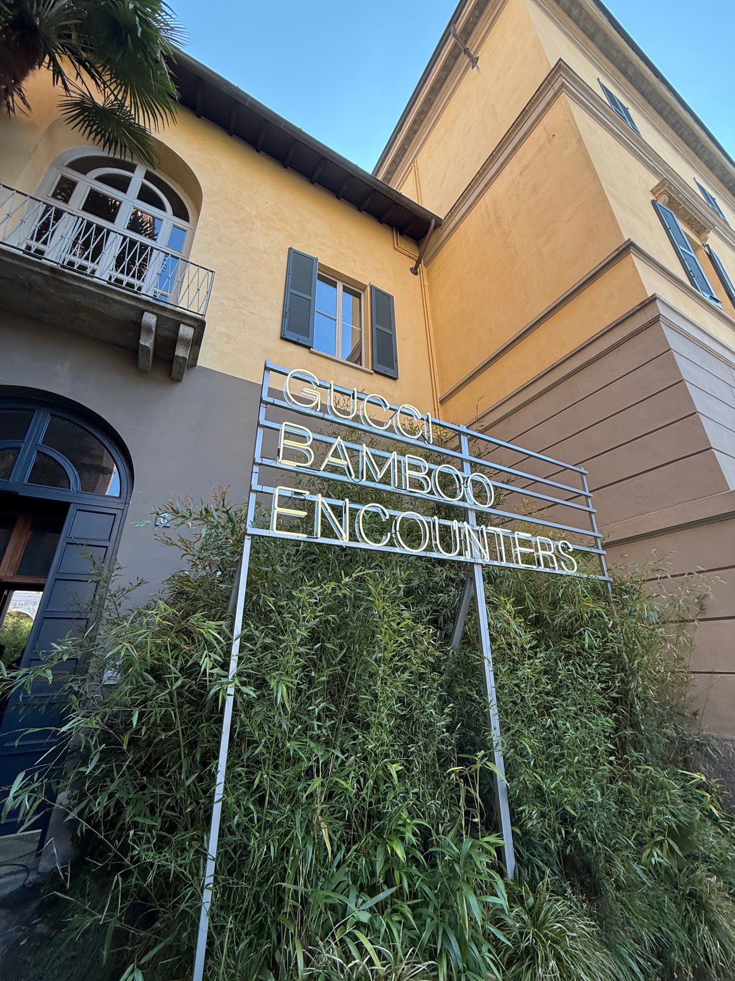 A short walk and a few buttery bites later, I arrived at the Chiostri di San Simpliciano, where Gucci’s Bamboo Encounters exhibition was unfolding with all the quiet drama of a Fellini dream sequence. Men in tuxedos were managing the queue like we were entering a gala at La Scala, not a cloister. It was sunny, surreal, and slightly ridiculous—which is to say: perfect.