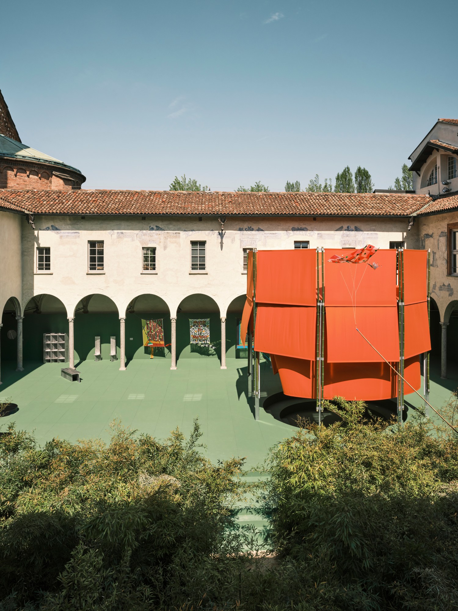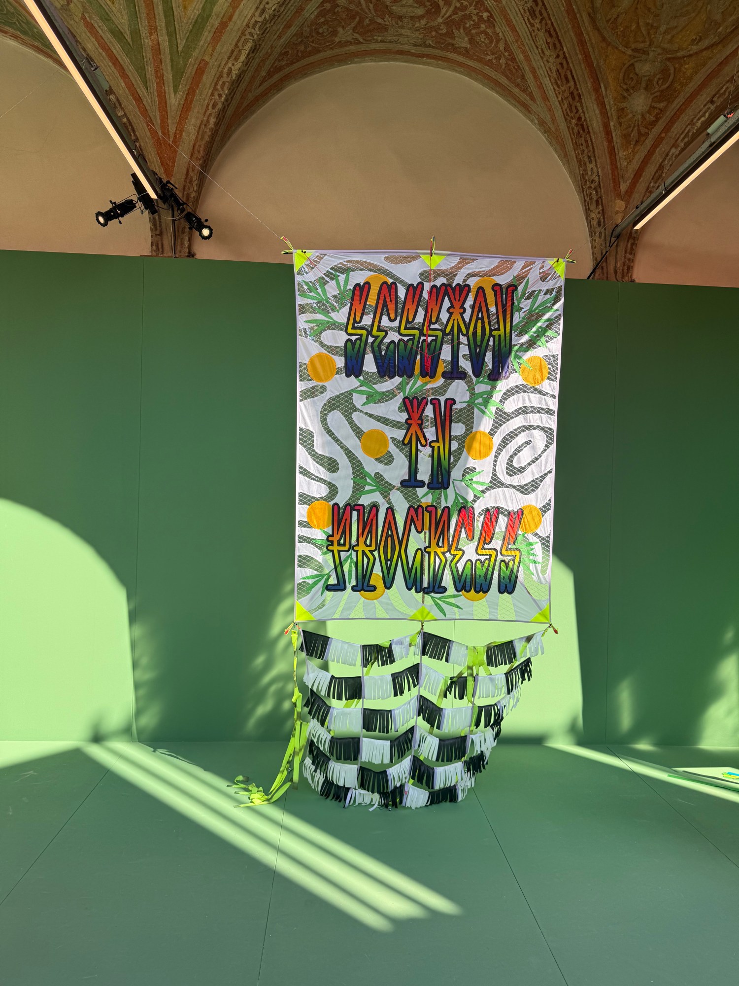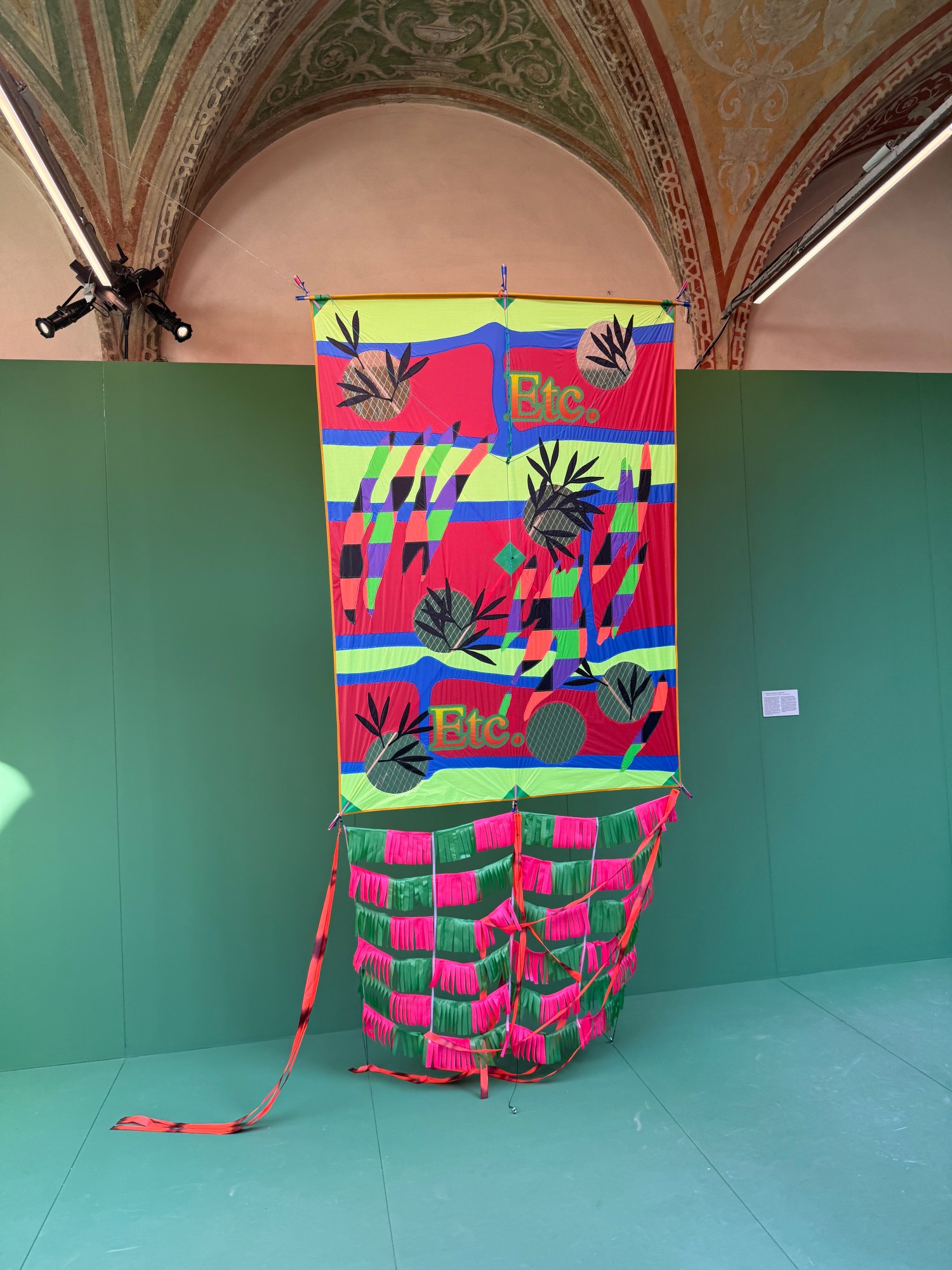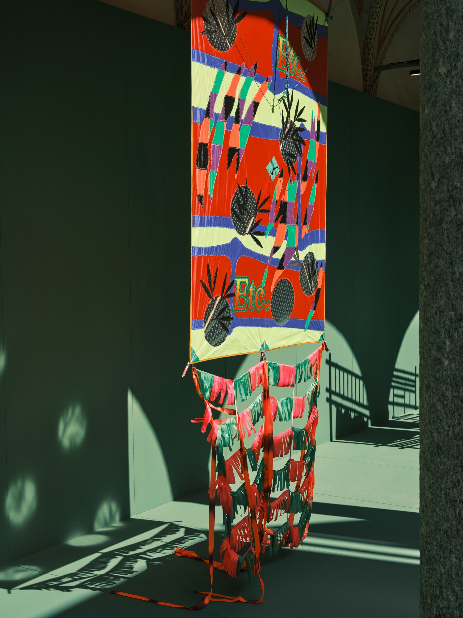Kite Club, meanwhile, had other plans. Their contribution was a series of kites, part tribute, part love letter, flying above the courtyard thanks to a custom-built bamboo wind machine (because Milanese air just wasn’t giving that day). “Thank you, Bamboo,” one of the kites read. It was earnest and adorable, yet slightly anarchic. Very kitecore.
