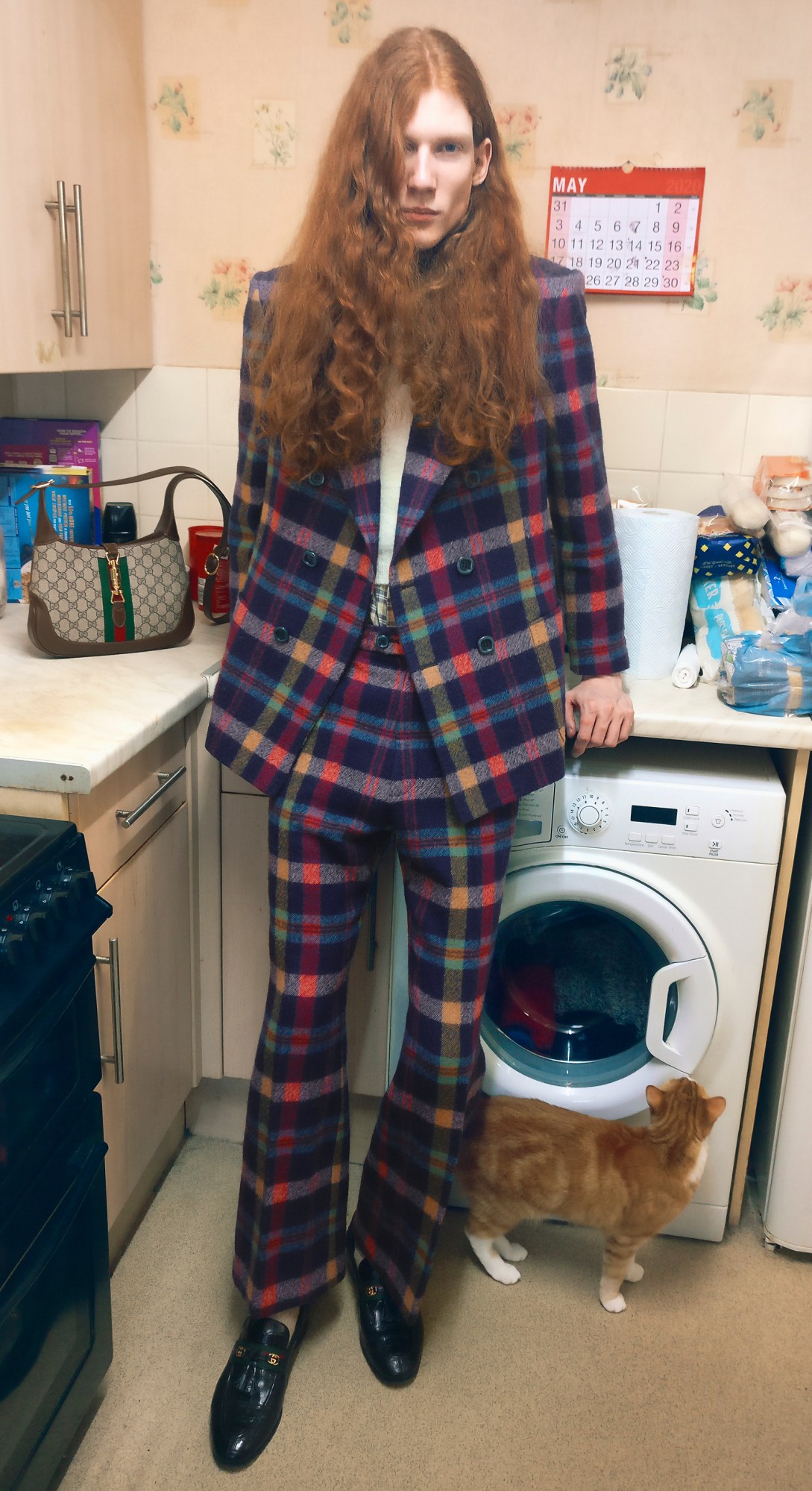 In the advertising campaign video, the clothing from the AW20 collection inhabits the models’ worlds as they wear Gucci’s billowing lacy Edwardian-style dresses while mopping the floors and loading the washing machine. As they sunbathe in a mint green two-piece suit, climb ladders in knee-high socks and platform heels or skateboard indoors in a crop top and Gucci’s now iconic oversized retro glasses. All while singing and dancing to the classic summery pop song “Alright” by Supergrass. A little bit of the spectacle, extravagance and theatricality we’ve come to expect from Gucci is added to the banal, menial and everyday rituals we’ve all come to know (and love?) so well in lockdown.