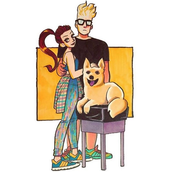M: This last christmas Hana got me an illustrated portrait of the two of us with Eevee done by my favorite illustrator, Bryan Lee O’Malley.