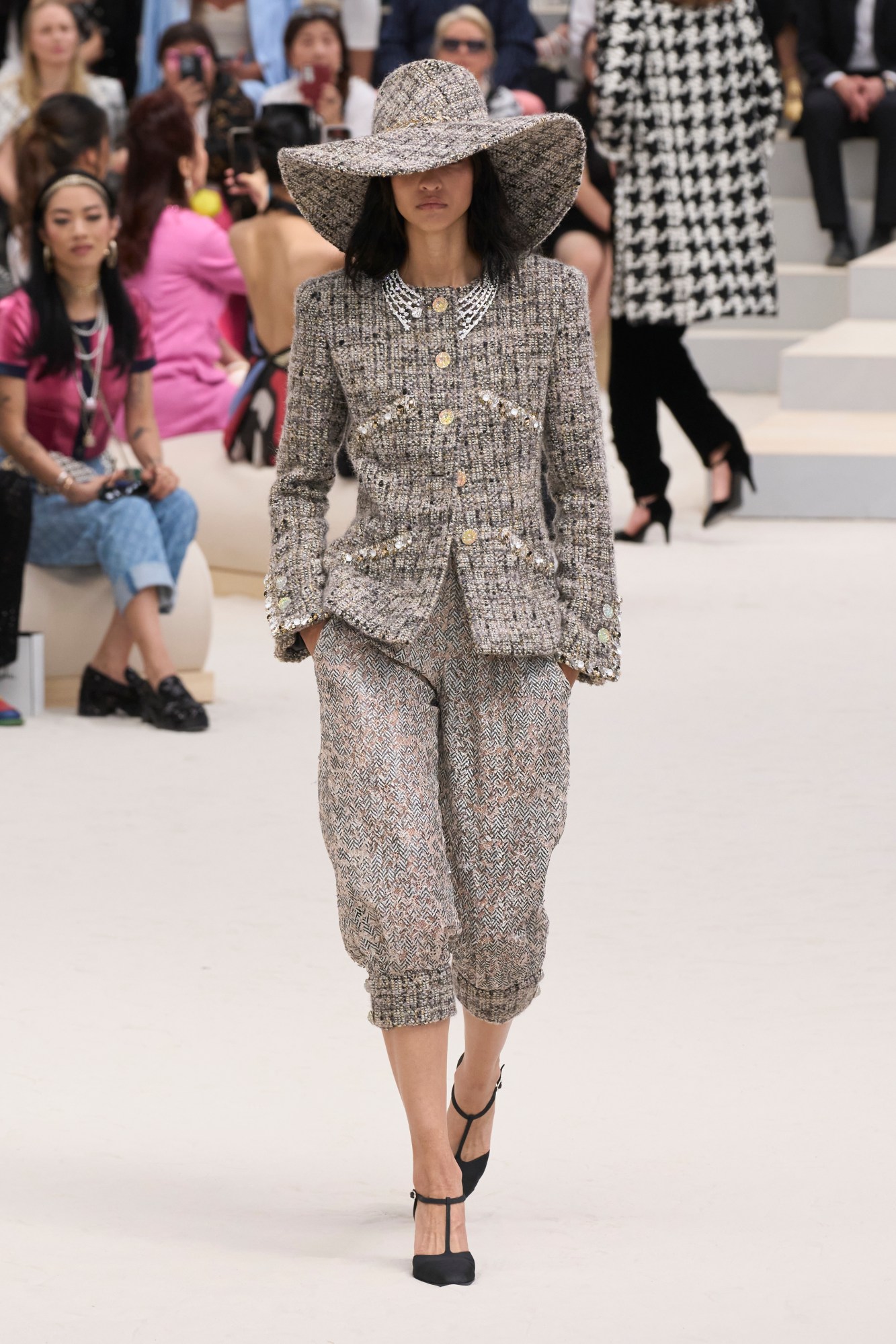 Chanel’s signature fabric, bouclé tweed, is not exactly lightweight, but in the hands of creative director Virginie Viard, the classic Coco suit looked resolutely cool on a day when temperatures rose to incendiary degrees in Paris. That is no easy task. Chanel is one of the grande dames of couture, a bastion of tradition and arguably the most couture-y of all couture houses, given that it’s the last one immune to brand collaborations, e-commerce and faddish experimentation. Chanel is couture, and couture is Chanel. But with that heavy mantle of heritage, there can sometimes be a reluctance to move the needle forward. Here, strides of progress and evolution are made in millimetres of soft pleating, delicate featherwork and the ever-so-slightly adjustments to the silhouette of that world-famous tweed suit. Speaking of which, this season they were given a slouchier fit with rounder shoulders and square backs, and worn with generously longer mid-calf skirts. The result was something of a cooling down of the sometimes-uptight bouclé look, a bit more relaxed and — even when worn with millions of euros worth of diamonds to celebrate the 90th anniversary of Coco Chanel’s first fine jewellery collection — a look that manages to make something as old as fashion itself seem like a desirable proposition for this autumn.