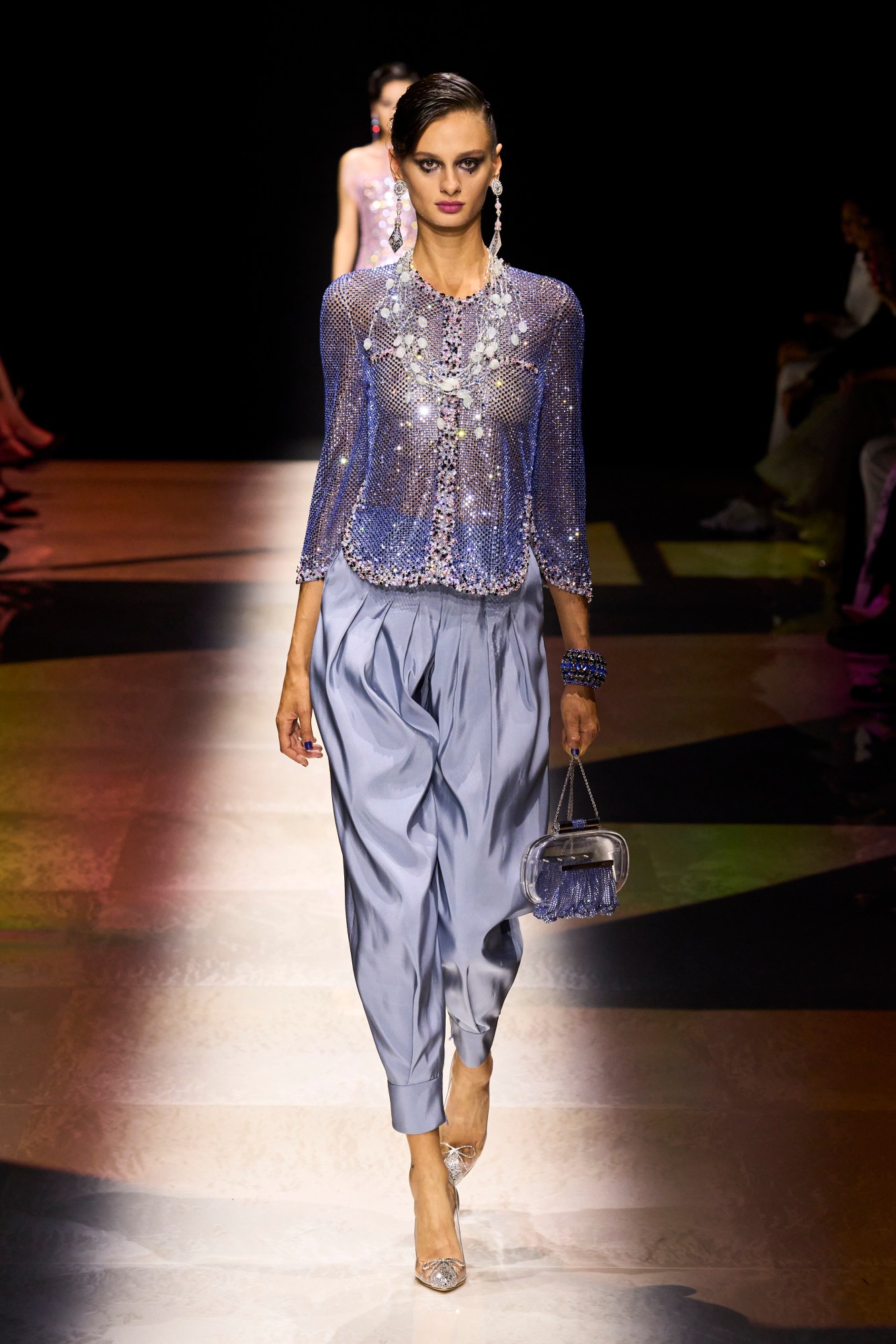 Always one for a theme (remember when most designers went for one?), this season Mr Armani dived deep into the world of sparkle. “Pétillant” (translation: sparkling) was the name he chose for his latest Privé collection, which was conceived “from a need to give new space to sparkle and frivolity, offering an escape into dreams and creativity,” according to the show notes. Inspired by Polish painter Tamara de Lempicka, there was an overarching Art Deco mood to the 20s-style dresses with gossamer layers of frizzante fabrications. There were elongated, curvilinear trousers, worn with sparkling blouses and Armani’s signature beaded jackets, and plenty of weightless 30s-style diaphanous dresses in myriad shades of blue and pink, sparkling in every way imaginable (lamé, chainmail, sequins, iridescent jacquards, floral paillettes, light-catching bugle beads). It was the kind of clothes that a woman might need for a formal after-dark affair, the kind of dresses that would look dazzling paired with mouth-wateringly large sapphires and rubies.