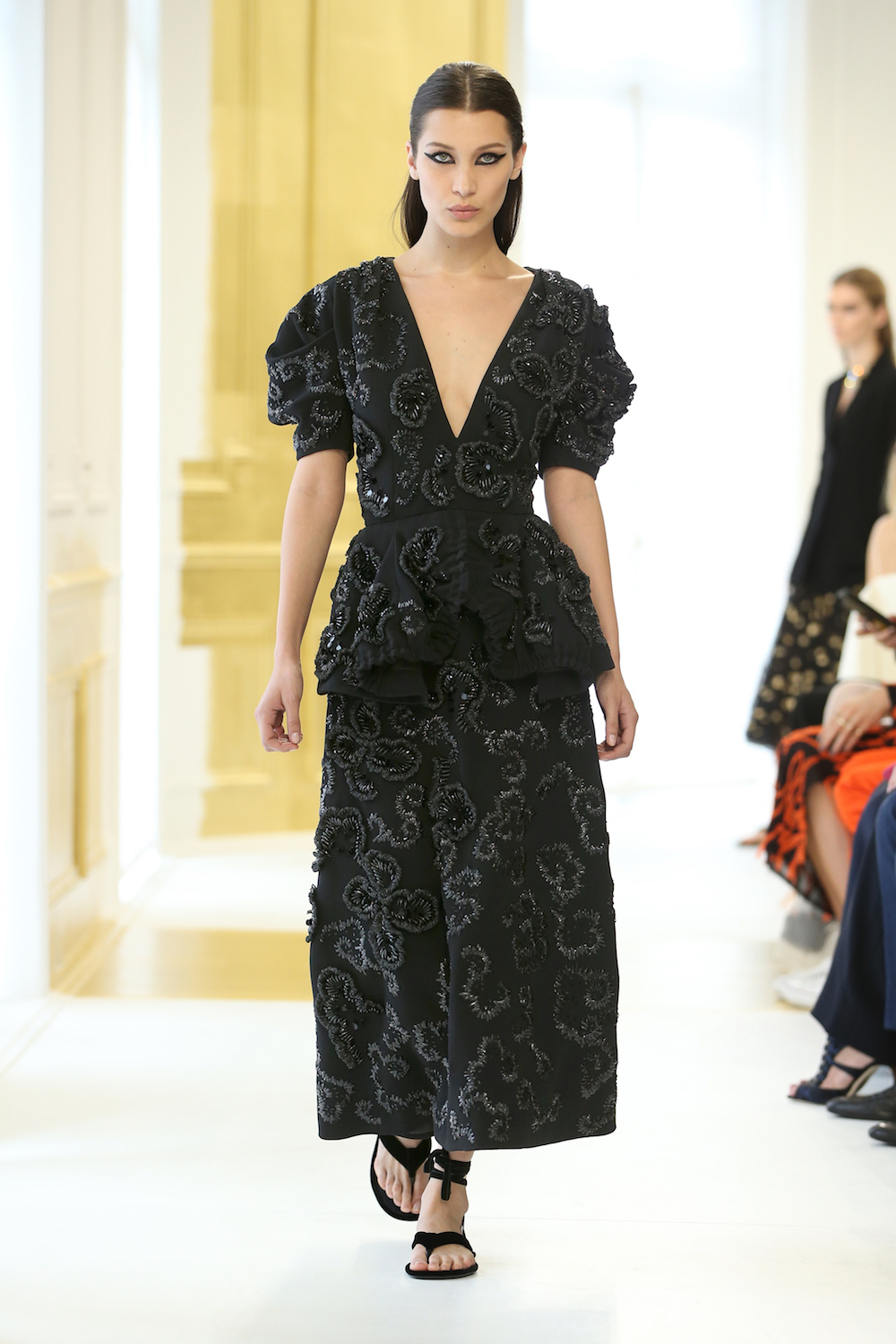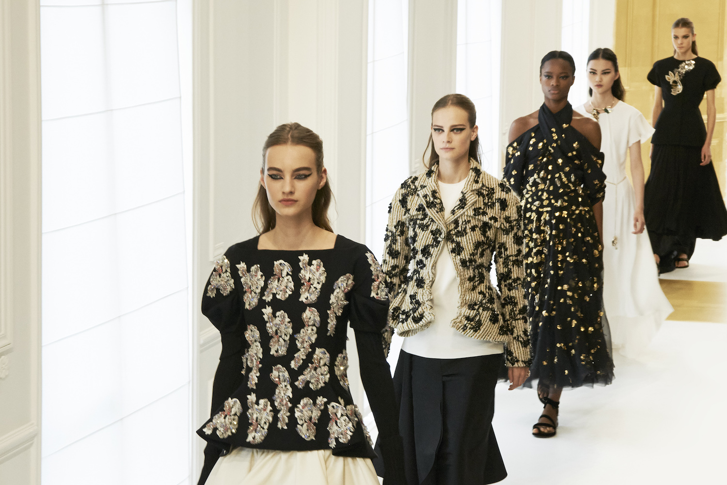 It was the quintessence of good taste, the way Monsieur Dior intended it, rooted in his Bar jacket, which shape-shifted into sculptural tops with delicate embellishment. Blacks, whites, and gold dominated throughout, like some stripped-down statement of simplicity. It was Meier and Ruffieux laying bare their talent — for both craftsmanship and the ability to interpret the legacy of a house. Over the past six months at Dior they haven’t had a chance to show the public their personal aesthetics, and it hasn’t been their job either. Instead, they’ve handled the difficult task of killing time before the arrival of a new creative director with total grace and sophistication. They are a class act, and one we’ll hopefully see more of in the future. Couture client Celine Dion, looking fabulous front row in a summer glove, would doubtlessly agree, although the Roman slimline gowns Maria Grazia Chiuri has perfected at Valentino seem made for her slender stature. If rumors are true and Chiuri is going to Dior, Justin O’Shea will get some serious competition on the haute couture schedule.