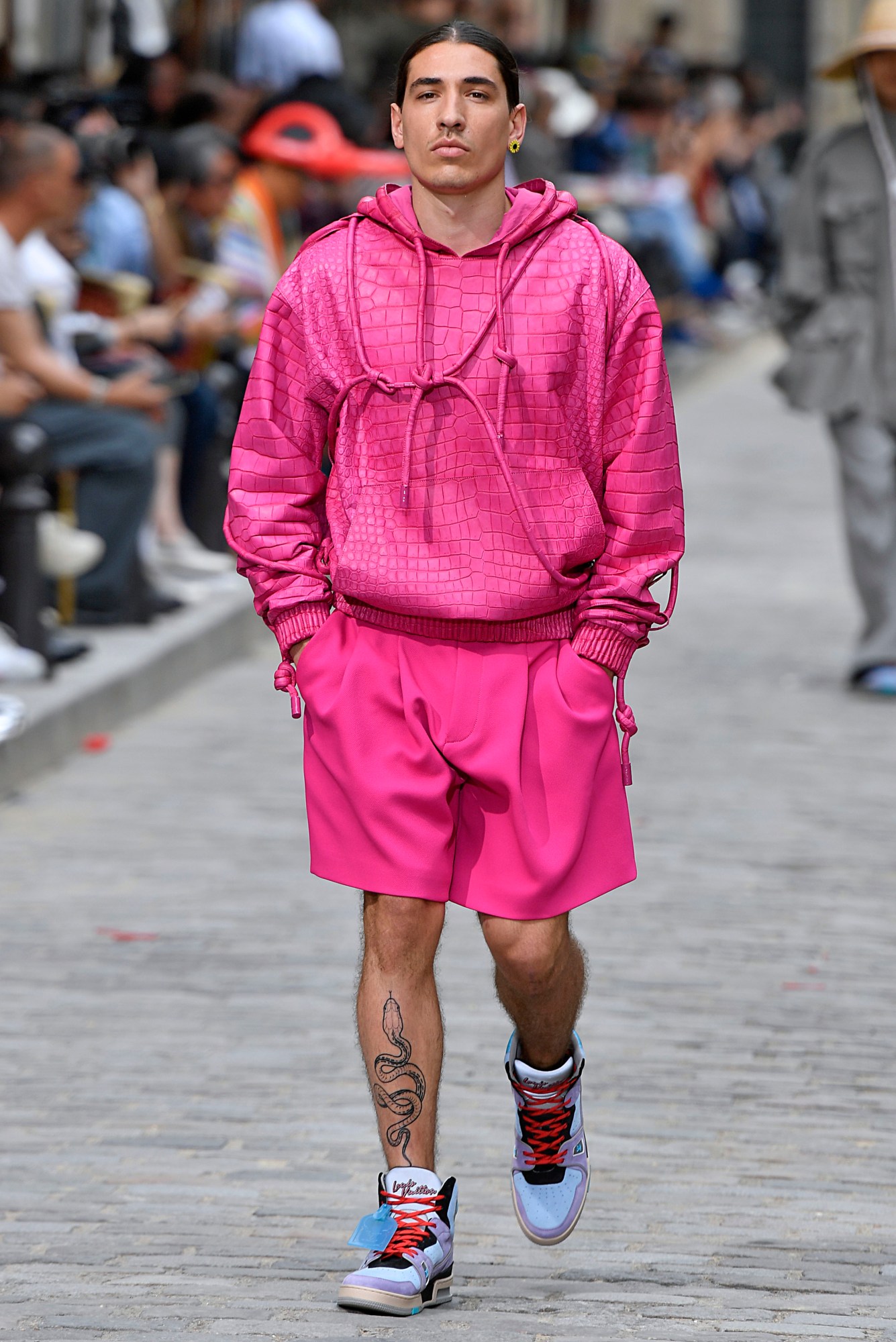 In his self-produced documentary, Unseen Journey, Héctor describes this opportunity as one that was too good to turn down. Having just relearned to walk after being sidelined for a year by a devastating knee injury, the Spanish footballer was asked to walk for Louis Vuitton by his good friend Virgil Abloh. His year off the pitch gave him plenty of time to reflect on what else in life he was interested in, and he was able to fully engage in his love of fashion. An instant success on the cobbled runway at Virgil’s third show for the Parisian house, Héctor wore an eye-catching fuchsia croc-embossed hoodie paired with matching shorts which revealed scarring from the recent surgery on his left knee. His runway debut was a sign of things to come, as Héctor’s involvement in fashion grew exponentially from this moment onwards.