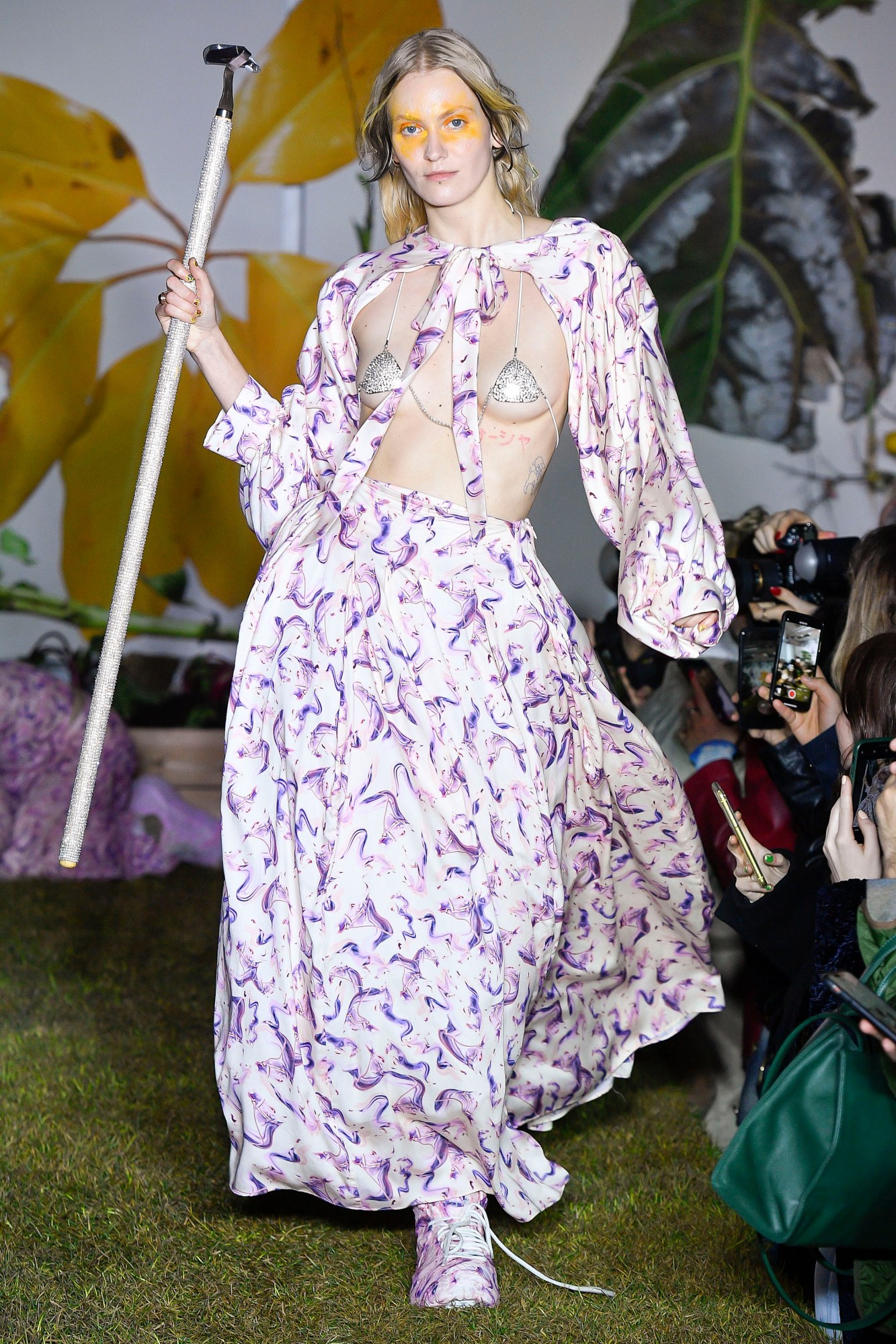 Collina Strada’s Hillary Taymour is using fashion — and her decidedly cottagecore aesthetic — to motivate others to think and act more sustainably. The eco-conscious designer’s most recent outing, titled “Garden Ho”, was held in a makeshift garden in New York City’s music venue The Dance. A pre-show monologue implored its audience to bring travel mugs and tupperware to cafés and restaurants, espoused the virtues of fruits and vegetables and outlined the effects of carbon emissions. During, show models picked vegetables and danced down the grass-covered runway wearing Taymour’s hallmark florals, playful patchwork and tie-dye. Accessories included rhinestone-embellished reusable water bottles and gardening tools. The idea behind the show was to inspire others to start growing their own food, to become more self-sufficient, and in turn, more environmentally-conscious. As the show notes read: “get outside and be a garden ho.”