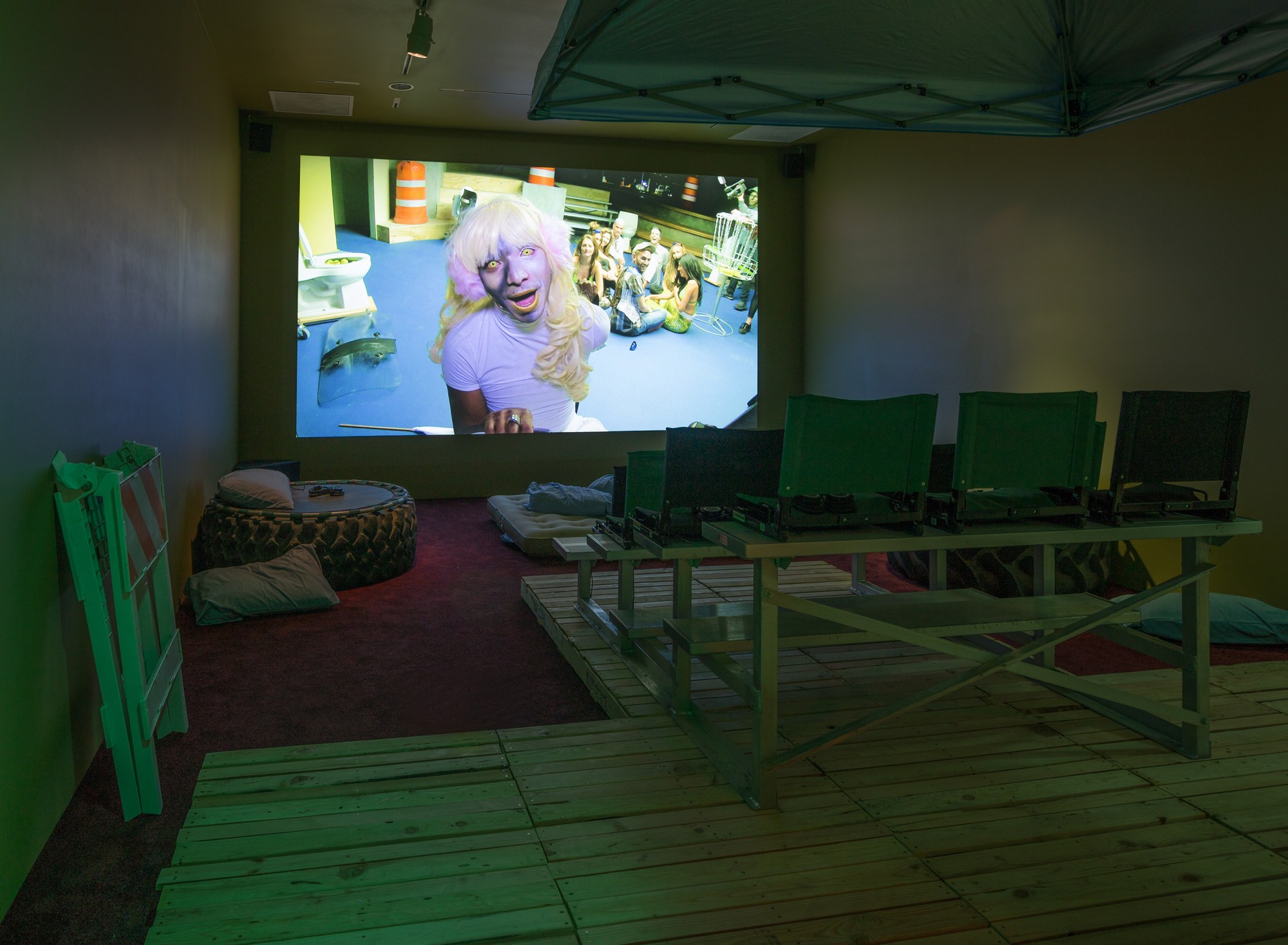 In Look At Me, Amalia Ulman discusses selfie culture and the performativity of social media through her five-months long performance Excellences & Perfections, in which she created a new, scripted identity documented through photos and captions on Instagram and Facebook. She caricatures a consumerist lifestyle and undergoes an extreme, semi-fictional makeover, pretending to have a breast augmentation, strictly following the Zao Dha diet and attending pole-dancing classes, and posting photos in expensive lingerie amid curated interiors rife with floral bouquets. Digital artist Jon Rafman, typically known for his work with Google Street View, presents “Transdimensional Serpent” in Touch Me, in which viewers sit atop a giant, white snake and are then transported via Oculus Rift into a virtual reality experience at once beautiful and disturbing. In Sell Me Out, viewers encounter Hito Steyerl’s immersive video installation Factory of the Sun, which plays within a dark room overlaid with a grid of fluorescent light, immediately reminiscent of Tron’s sci-fi cyberspace. The video, which debuted at the German Pavilion at the 2015 Venice Biennale, follows an absurd narrative — a critique of surveillance culture told through a blend of news coverage, video games, and dance videos — about workers forced to create sunlight by moving within a motion-caption studio but are given the chance to fight back against the powers that be.