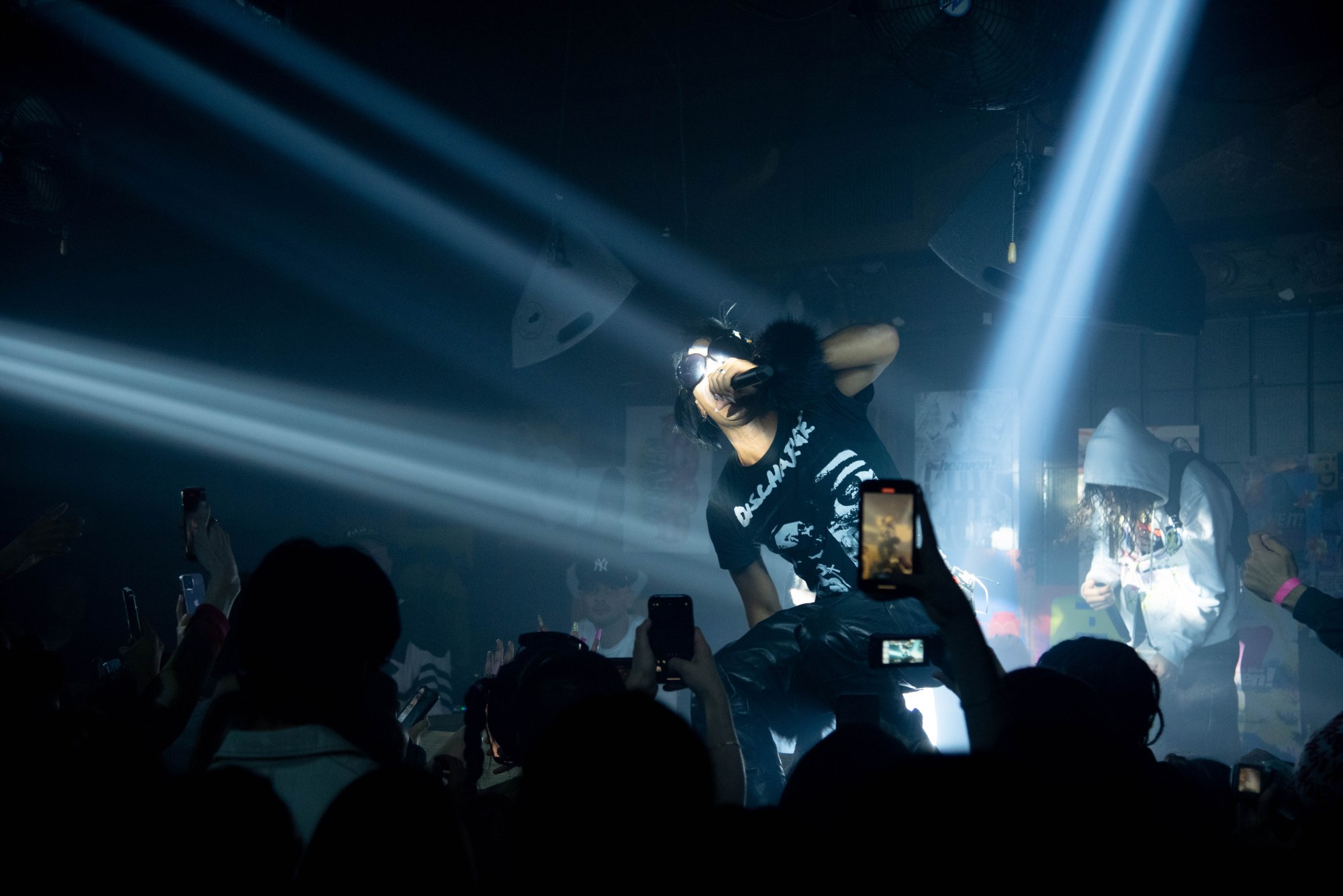 Kicking off at 10pm, Stockholm experimental favourites Bladee and Ecco2k performed to hundreds of attendees. Most of the partygoers were self-described disciples of the young cult label, put best by Marc Jacobs itself as “a gateway into the sprawling and enigmatic omniverse of Marc Jacobs subversion.”