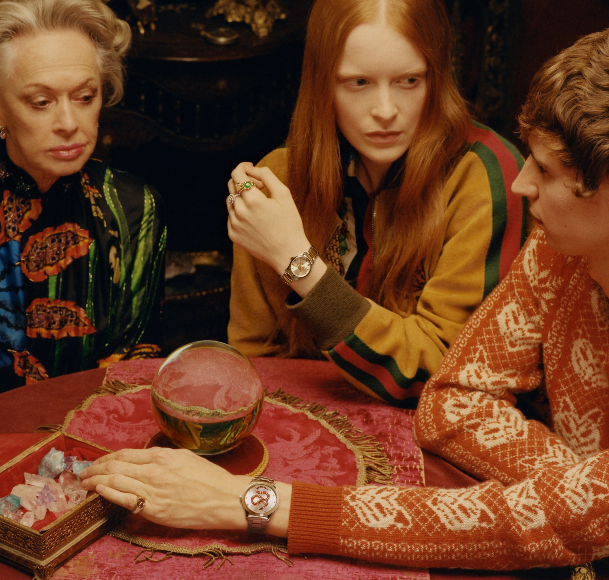 Shot by photographer Colin Dodgson, the images channel the otherworldly spirit of Gucci Timepieces and Gucci Jewelry [they mean “jewellery” but are writing it like what Americans do], by presenting Hedren as a fortune teller reading the fate of young visitors while wearing key pieces from the collections.