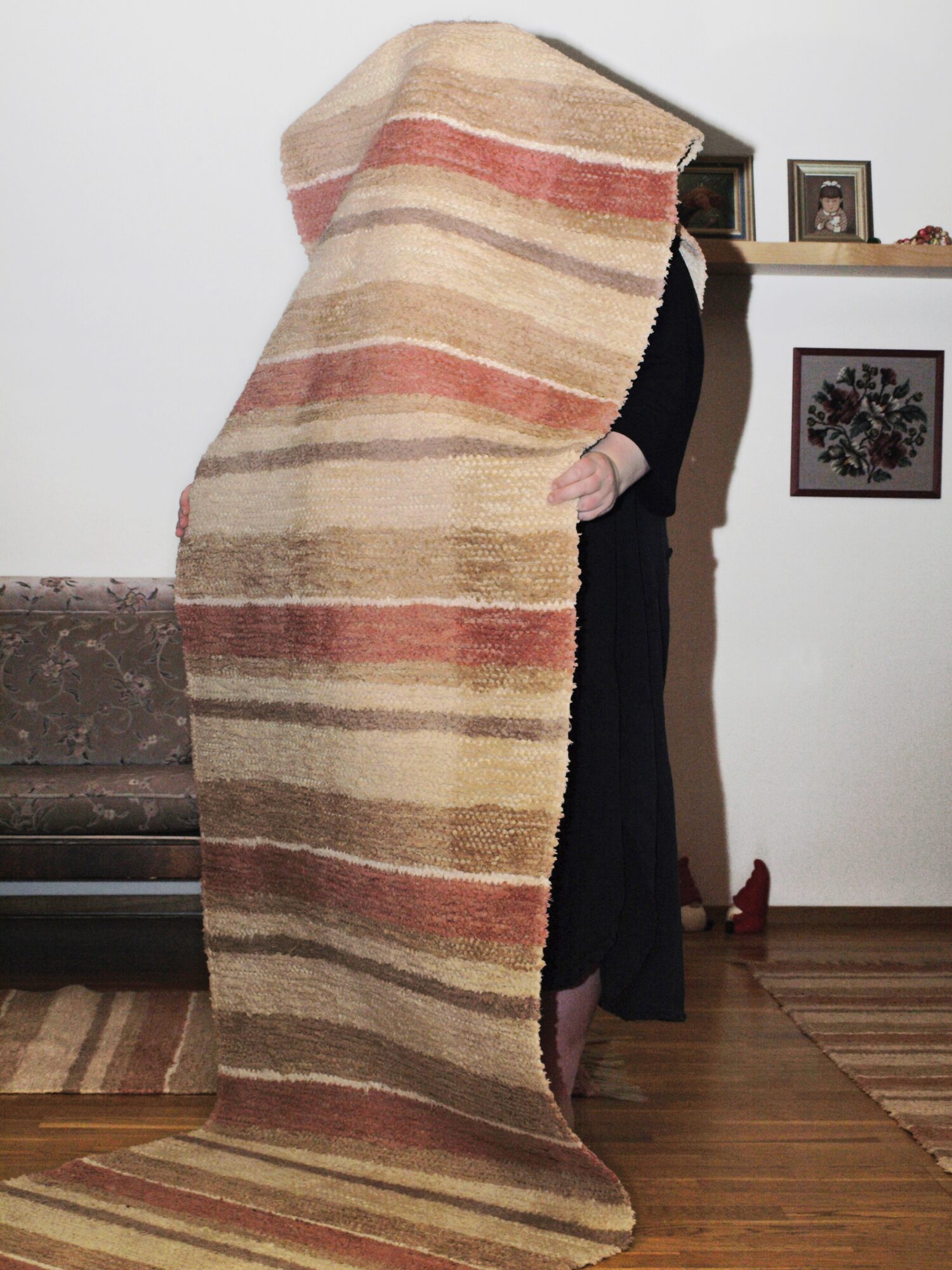 Iiu traces her interest in photography back to an early age, when she became captivated by its immediacy. “I like it because it’s fast,” she says. “As a child, I took photos for a while, but it was expensive because of film, so I stopped.” After picking up a digital camera in 2007, she started again, though she “never thought it would become a career”, given her training as a textile designer. This fascination with fabric materialises in her earliest photos, like “Large-Scale Cleaning”, where a rolled-out rug almost blocks her body from view. “In those pictures, I’m with an object, so you got something extra,” Iiu says. “Only a portrait would have been too boring.”