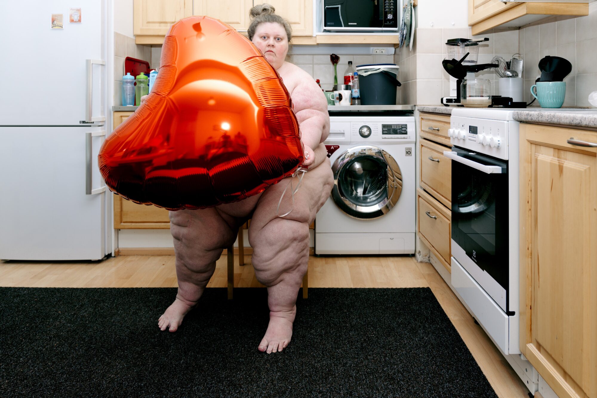 A woman sitting in a kitchen naked covered by a large red heart shaped balloon.
