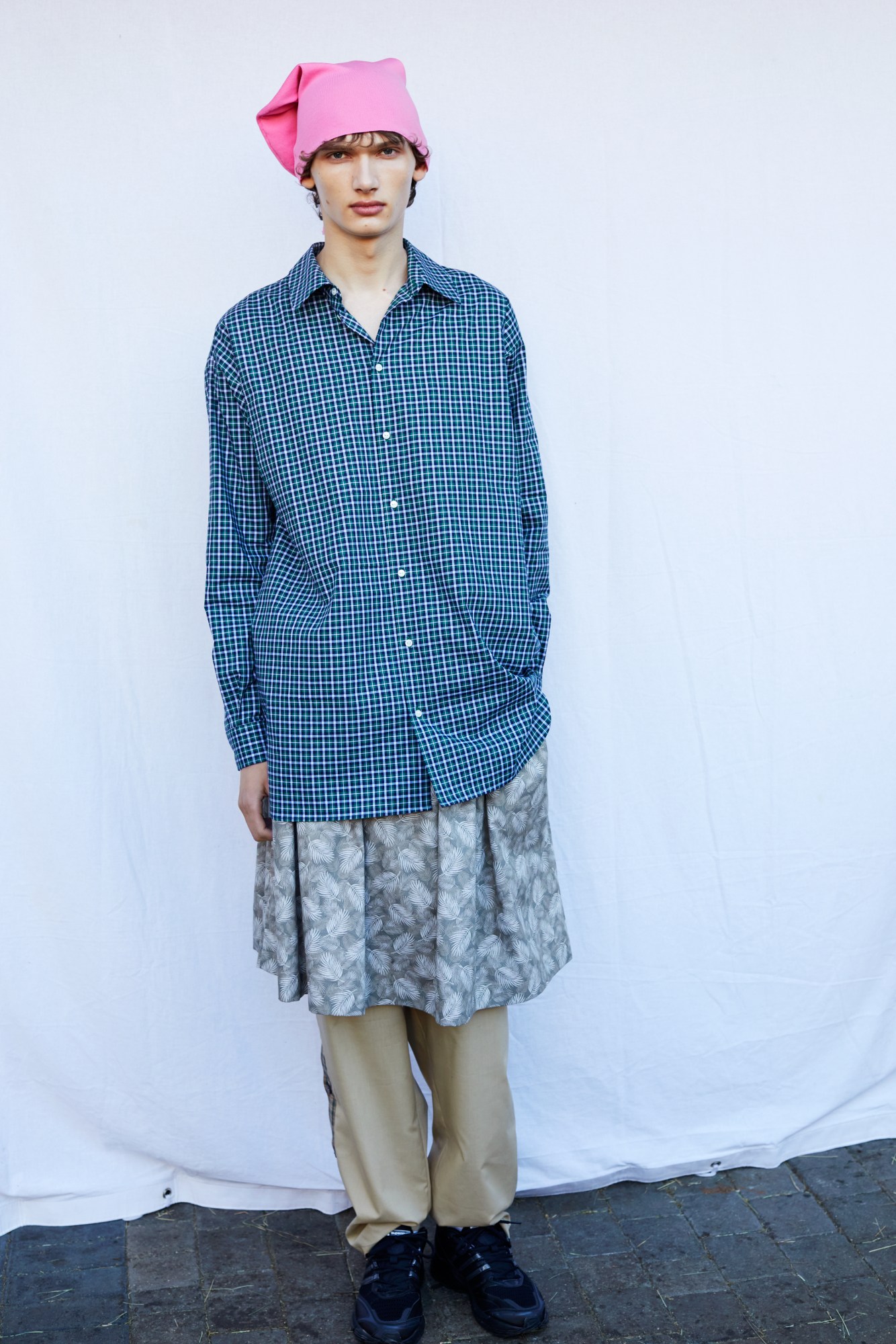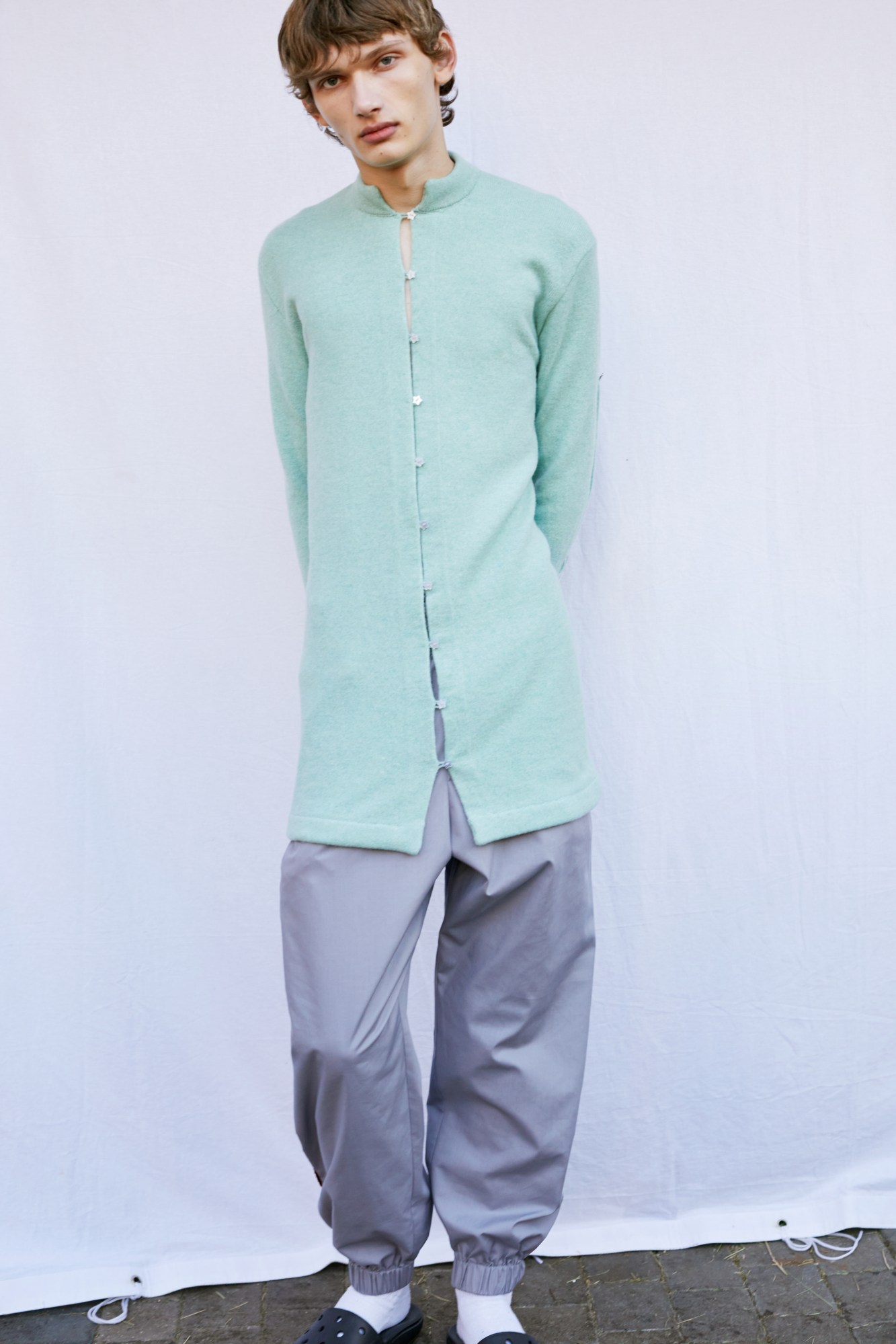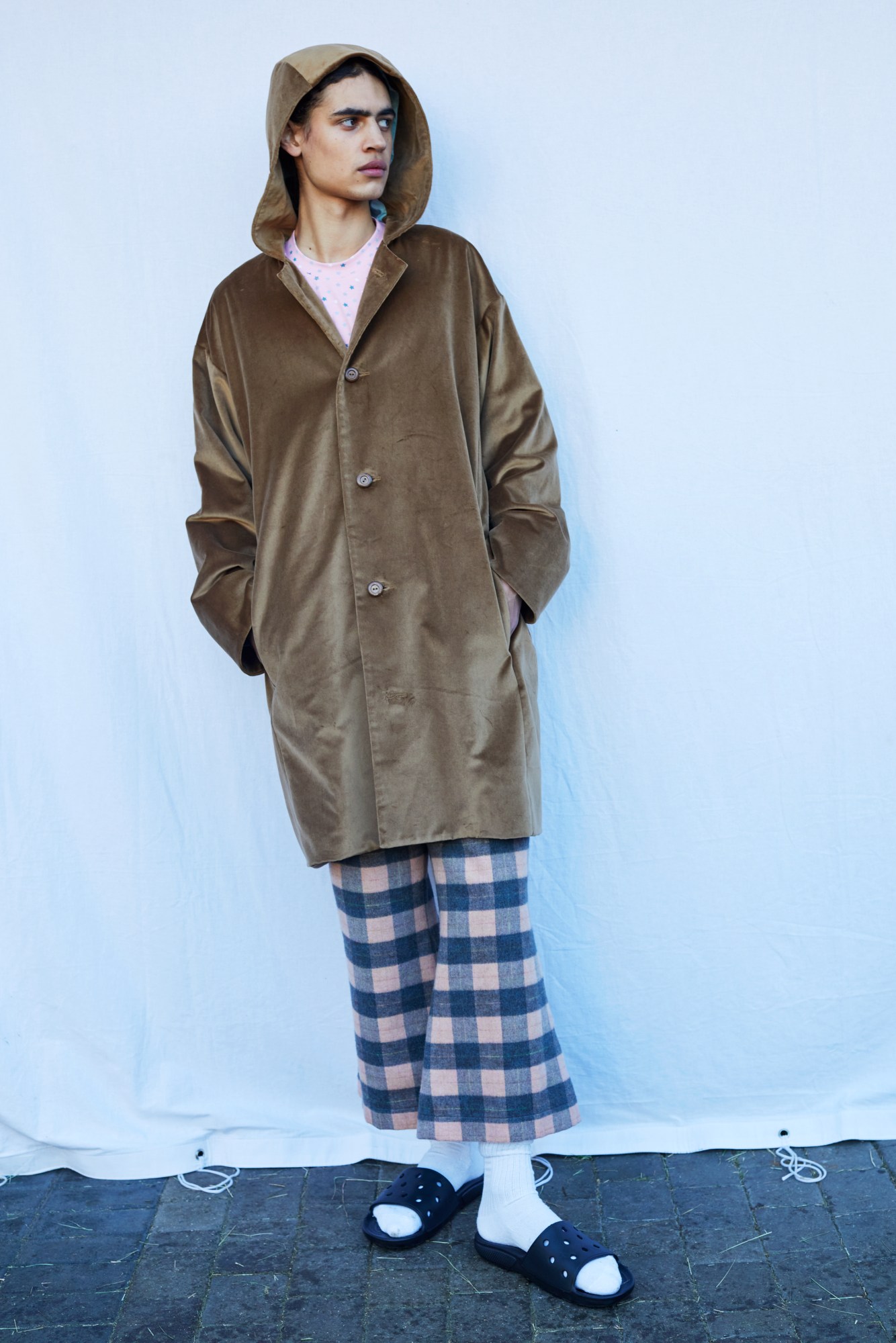 If you’ve been feeling angsty of late – like you want to scream a royal “FUCK YOU!” to our merciless overlords, and set out to start a revolt – then you have a friend in Lyna Ty, the creative director of Sydney-based label Song For The Mute. After last season’s exploration of the precarity that colours the times we live in, filtered through 90s sci-fi film, 23.2 takes a rather more tangible tack, riffing on humdrum dress conventions. Rather than give in to normie blandness, though, you immediately get the sense that this is a collection that has been designed as a defiant response against it. ‘Classic’ men’s overcoats in hefty tweeds and tailoring wools are counterposed by pieces like slouchy earth tones sportswear separates – an extension of the brand’s collaboration with Adidas – faintly hippyish floral silk plissé peignoirs, and tactical vests in neon-dyed shearling. On the womenswear front, the sternness of oversized tailoring is tempered by fluid teal silk cloqué slip dresses and halterneck jumpsuits in poppy polka dot knits, though the most noteworthy pieces are the coats bricolaged from swatches of wools, tweeds, corduroys and the like – the sartorial equivalent to ripping up the old rule book and sticking it back together as you like. MS