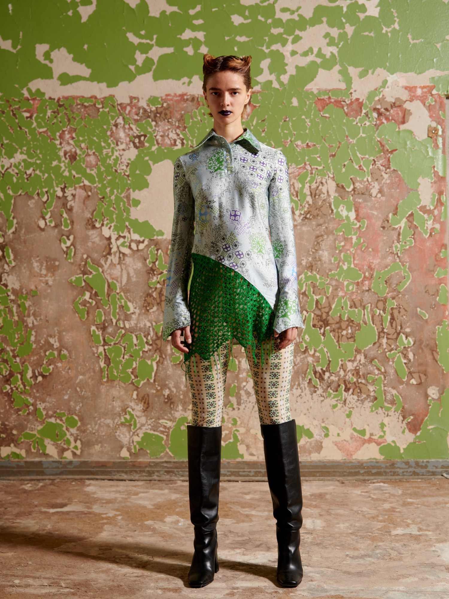 While the fashion industry’s focus so far this year may have been trained on Paris and Milan, over in Berlin, a new generation of attention-worthy talent is proving its chops. Among them is Soji Solarin, the Nigerian-born designer who now calls the German capital home. For their latest collection, titled SPAWN, they explored the mythical, life-giving qualities of water – and, in particular, the mythical beings that dwell in it. Tales of mermaids lifted from oral narrations from indigenous African and Latin American cultures inform the liquid flutter of shirting cut from printed silk, spliced with crochet netting, as well as faintly cyber knitted minidresses, which come in contrast hues and with a pour-over fit. A full-length quilted cape brings a spirit of monastic flair into the mix, while a zip-up track jacket-cum-cinched blazer and a tailored pair of bike shorts demonstrate the sharpness of Soji’s creative intuitions, innovatively fusing sportswear and formalwear to offer a directional proposal. MS
