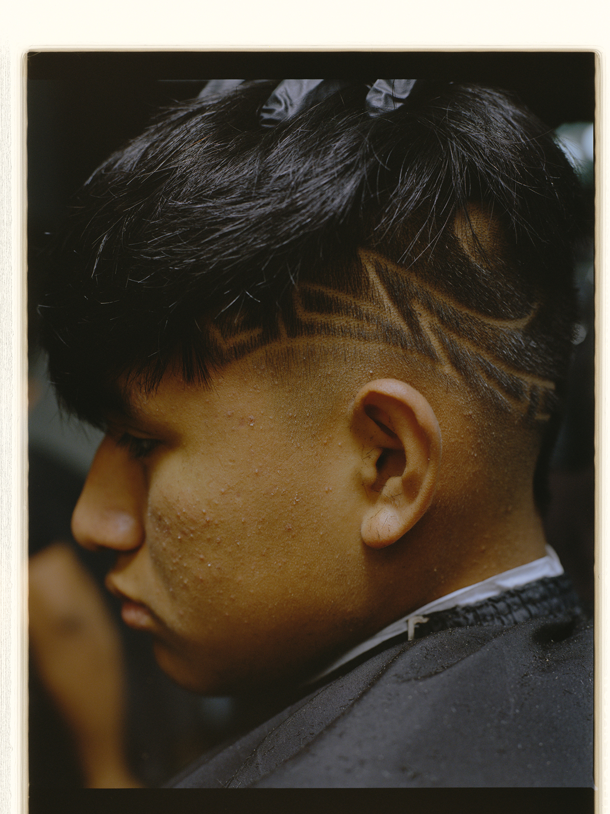 One girl wears a teddy bear shirt, “that’s so Chloe,” says Juan, her Rolling Stones socks poking out from a pair of vintage black jeans. But 15 minutes before she was in her traditional attire, he says, straddling the line between old and new. The boys have designs shaved into their thick black hair and drip with jewellery, their smartphones never too far away. In some stills, Juan captures the dichotomy: chickens running around by beer cans and liquor bottles, cowboy belts and gold necklaces that look like they’ve come from Texas, and shops selling trainers with a plastic Jesus icon at their centre — a nod to the country’s evangelicalism.