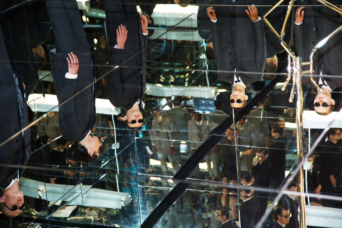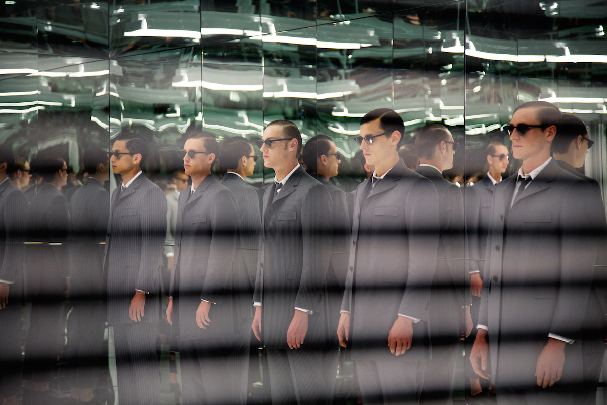 For his presentation today – during the first round of the revived New York menswear shows – Browne showed his collection within a small mirrored cube. The six sides hemmed in models and their observers, while also reflecting them into infinity – and providing infinite opportunities for trippy Instagram shots. It was a perfect embodiment of the designer’s genius for taking one and making many – in this case, transforming 27 looks (all grey three-pieces) into an unlimited army of sinister suits.