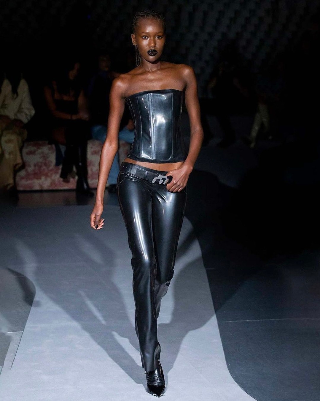Designing a made-for-runway collection also differs from creating a commercial offering. “Our design process was very challenged,” Alexia adds. “Miaou is pretty focused on specific categories. I had to put that aside to paint a picture of a world beyond just merchandising and individual pieces because it’s a runway show and you’re looking at 40 looks.” In addition to crafting runway-ready versions of the label’s signature corsets and trousers, Alexia had to consider “all the elements that support a garment,” designing handbags, jewellery and other accessories as supporting characters.