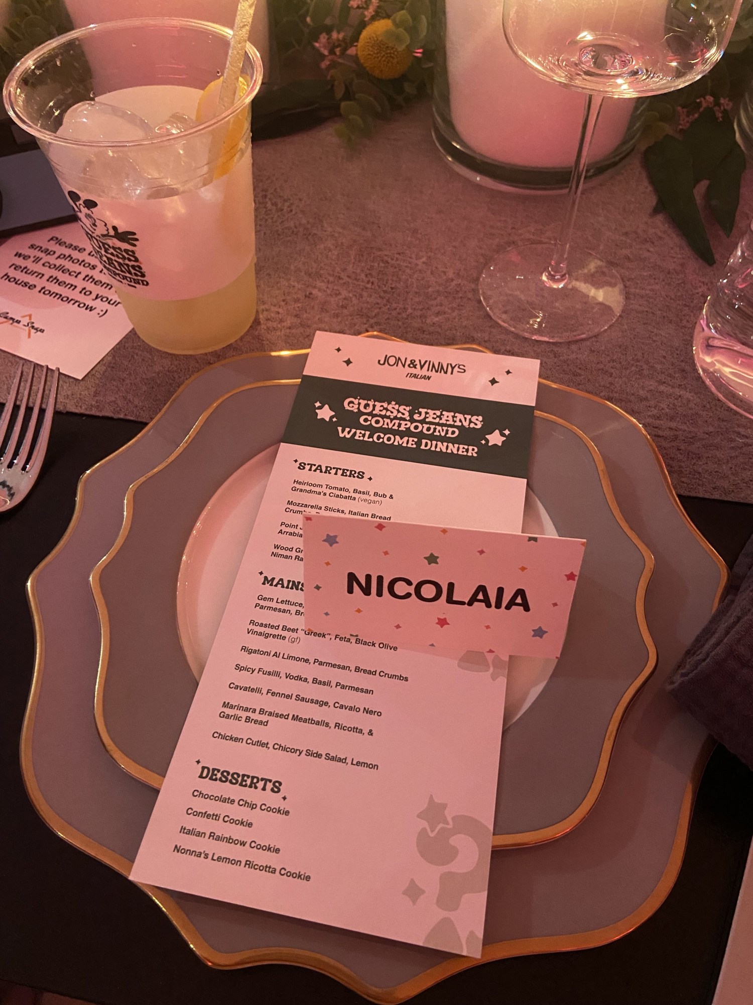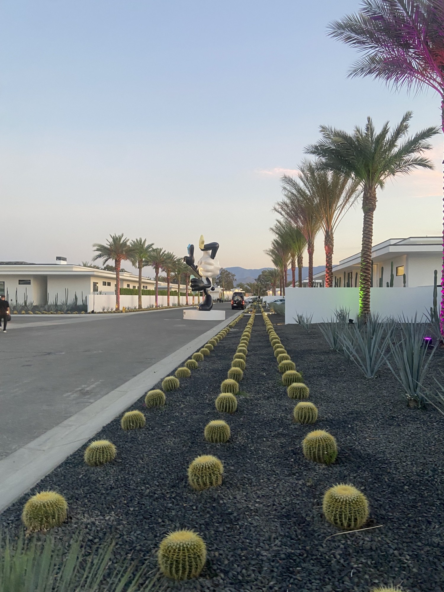 Onward to Palm Springs. I open my luggage at the hotel. It looks like I packed midair tumbling out a plane headed for Bora Bora: 3 pairs of ballet flats, 1 brown bikini (top and bottom), 1 sparkly bikini (just the top), several identical athletic shorts, 2 belts. There’s a care package for me from Guess which includes a nicotine free Acai berry flavored vape. A marvel. For dinner we are brought to the Guess Jeans Compound. Set against the Palm Springs landscape of cacti and palm trees, the Guess Jeans Compound is reminiscent of a film set, there’s a sense that if you walk too far you might just fall out of the frame. On the grounds there are about 12 free-standing homes, all clean lines and white walkways, 10 of which house influencers and other talent, one is devoted to wellness, and one for parties.
