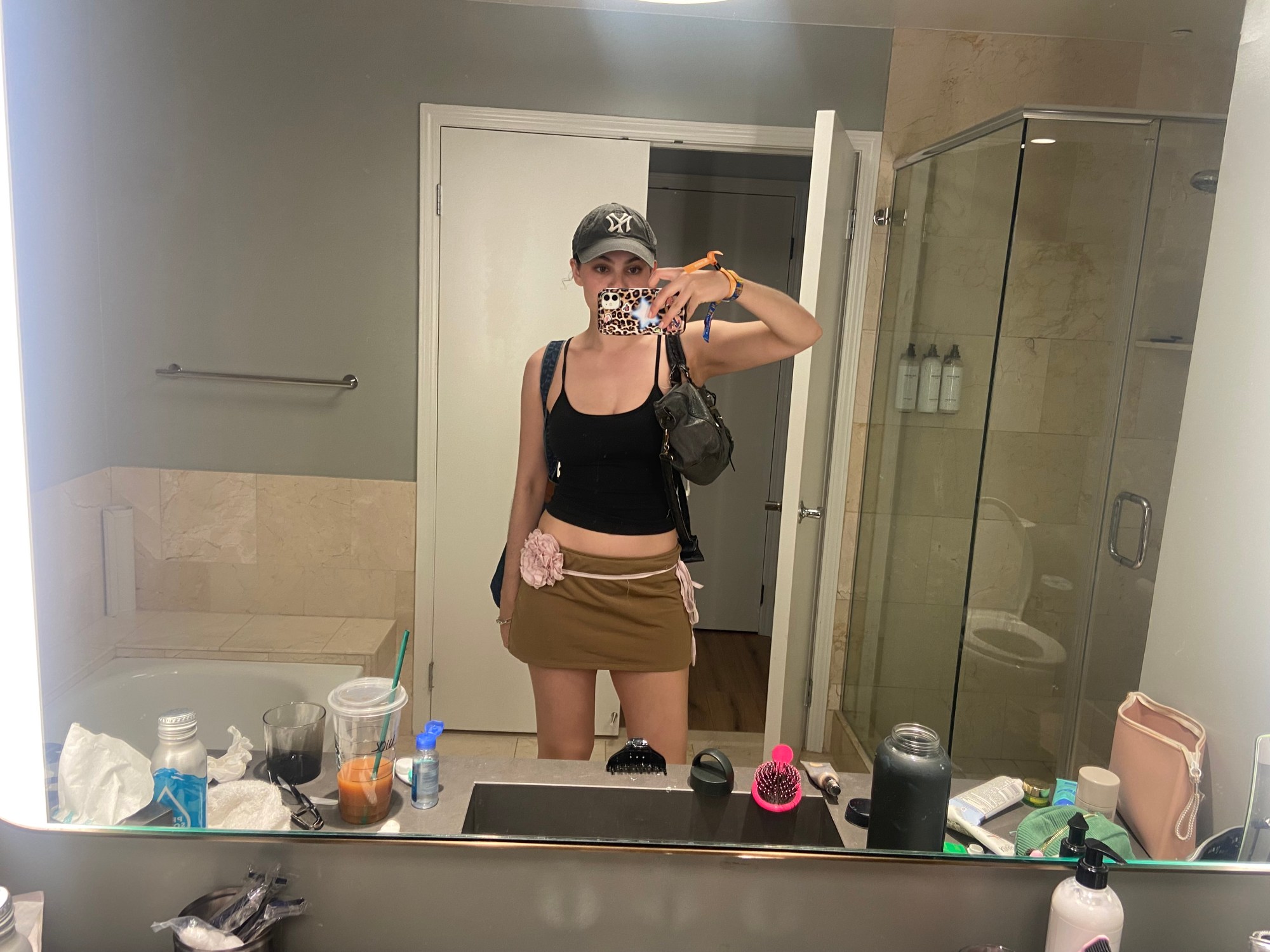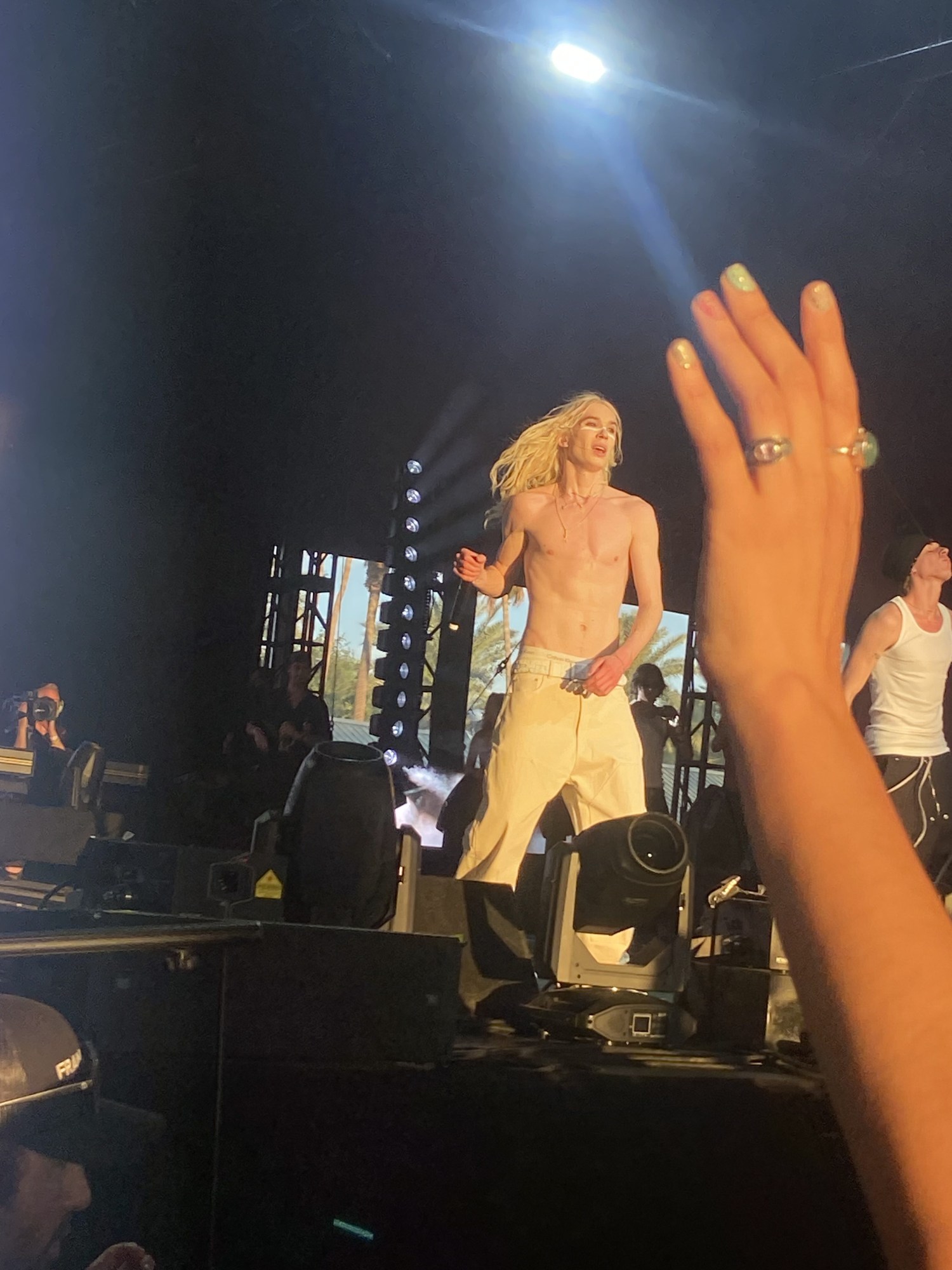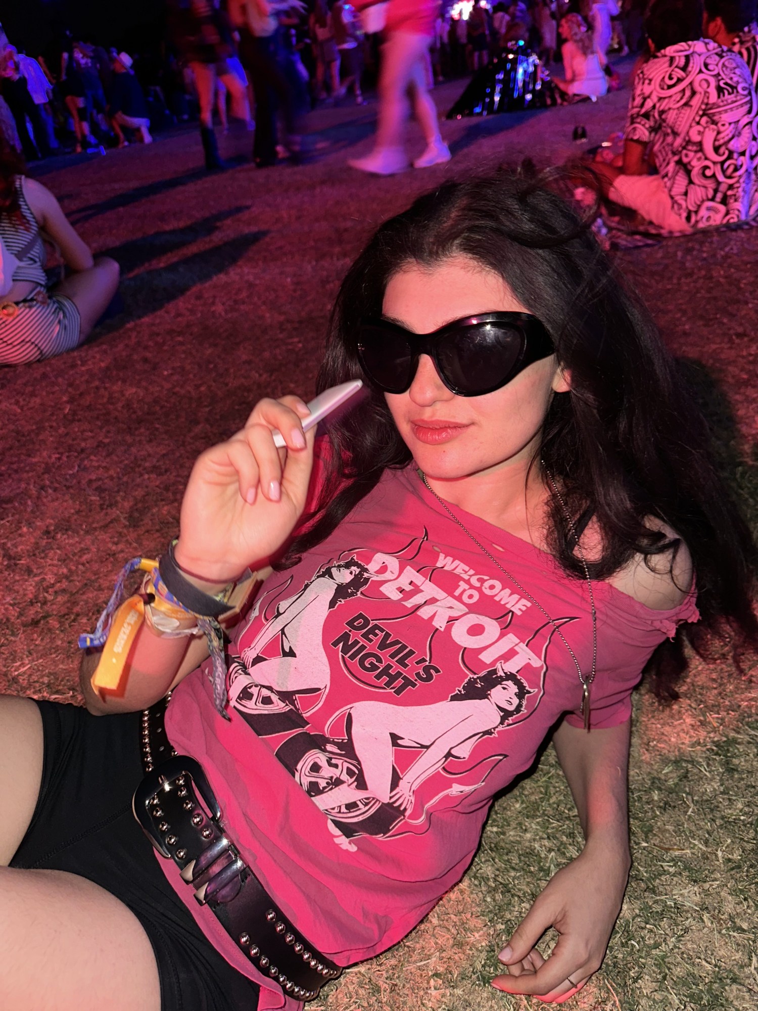 I get a blowout by Dreame at the wellness house in the compound which changes my entire personality. Then it’s Megan Thee Stallion! Jennie! Amyl and the Sniffers! Arca, giving goth Rosalía, brings out Addison Rae. Post Malone! I run into my friend Gabby and we discuss the pasta salads at Dimes Market for fifteen minutes because the best views of New York are always from somewhere else. Today is the first day, and the last, that I feel I actually understand how to dress for Coachella. A belt to nowhere has appeared round my waist holding my already perfectly fitting Guess jorts up. I realize I haven’t released the Acai berry-flavored, nicotine-free vape since I got it. A proper Coachella outfit, just like the festival itself, is an alchemical mix of things that shouldn’t work together—like boho chic and athleisure, cowboy boots and a Glorilla snapback, four different colored belts, Redbull and tequila, Post Malone and Gaga—but ultimately create something that’s well, fun? Or if it’s not fun, it’s at least an excuse to act a little like, in the immortal words of Green Day, an American Idiot.