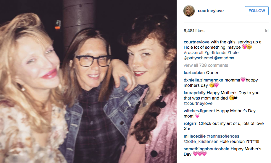Courtney Love got a lot of hopes up over the weekend with an Instagram post suggesting a Hole reunion might be in the cards. The frontwoman photo with her band mates — drummer Patty Schemel and bassist Melissa Auf Der Maur — with the ambiguous caption, “with the girls, serving up a Hole lot of something. Maybe.” She also tagged the one missing member, guitarist Eric Erlandson.