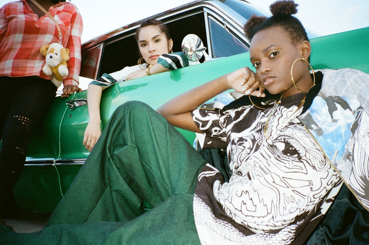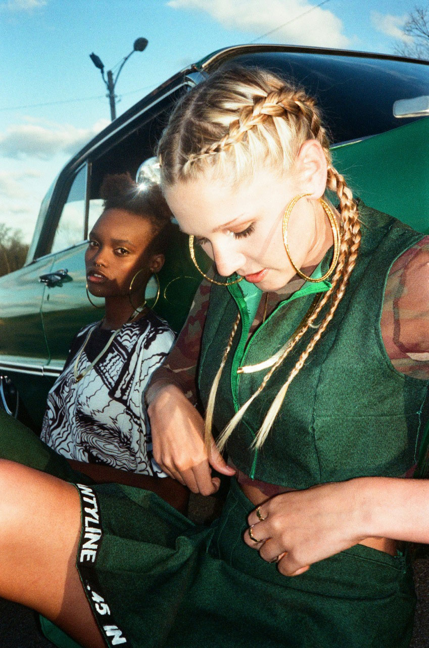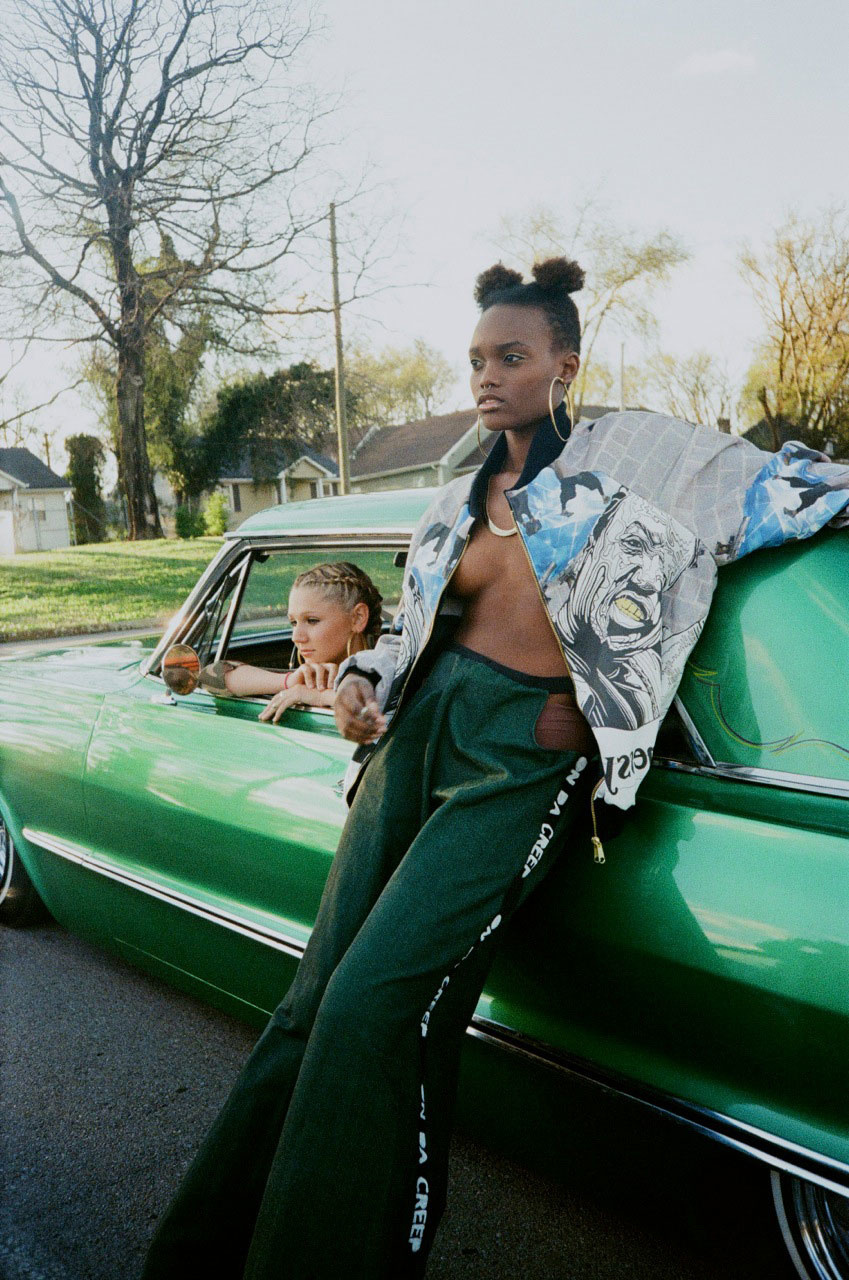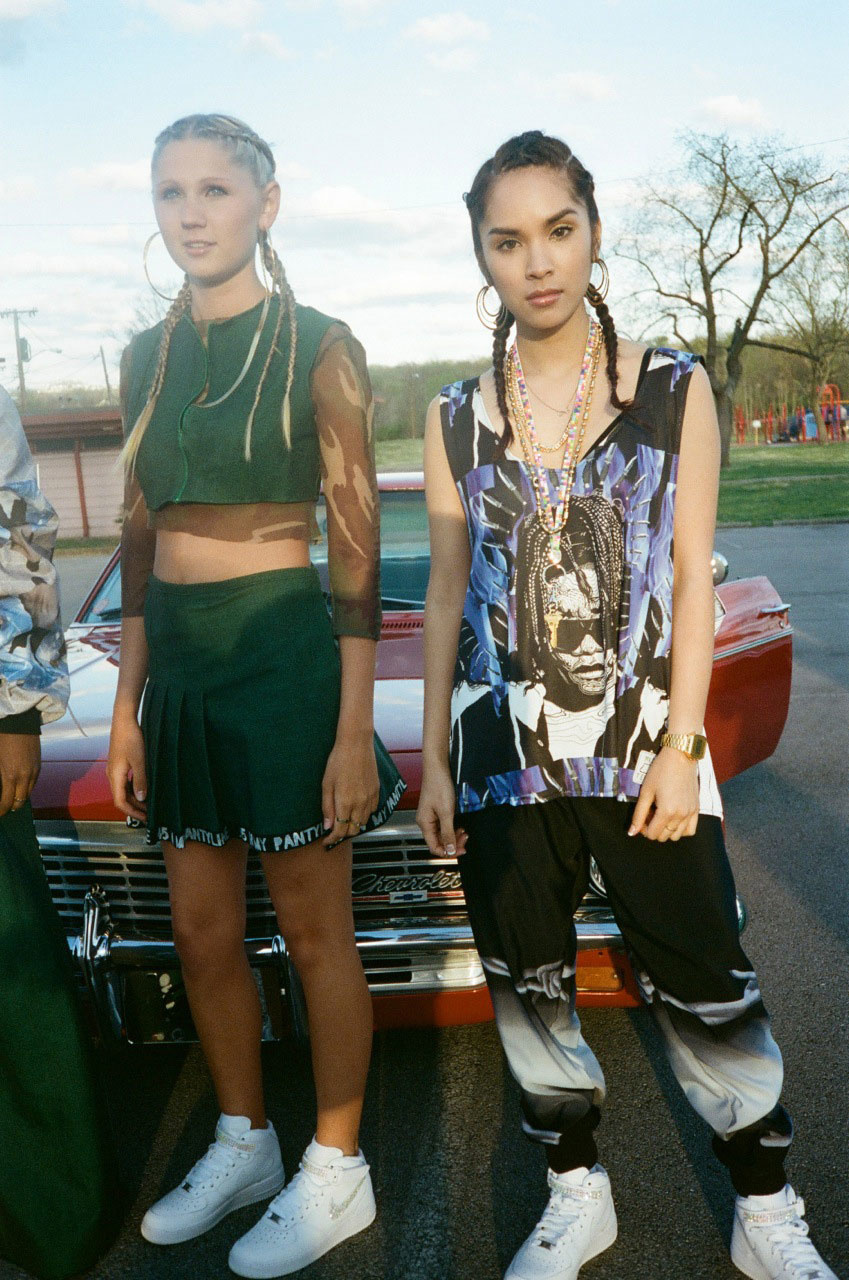 Isabel’s 2013 Parsons thesis collection Based, inspired by Lil B, was picked up by online retailer VFILES immediately and worn by pop princess Katy Perry. Her tie-dyed velvet bomber jackets, fishnet suede skirts, mesh crop tops and custom Timberland boots covered in Hindu-inspired digital prints of the Based God’s face, became Internet lore. The young designer returned to her hometown of Nashville to show her second collection Ten-a-Key, this spring. An homage to Tennessee’s early 90s rap scene. Collection highlights include green denim schoolgirl skirts hand-painted with Princess Loko and Tommy Wright III lyrics.