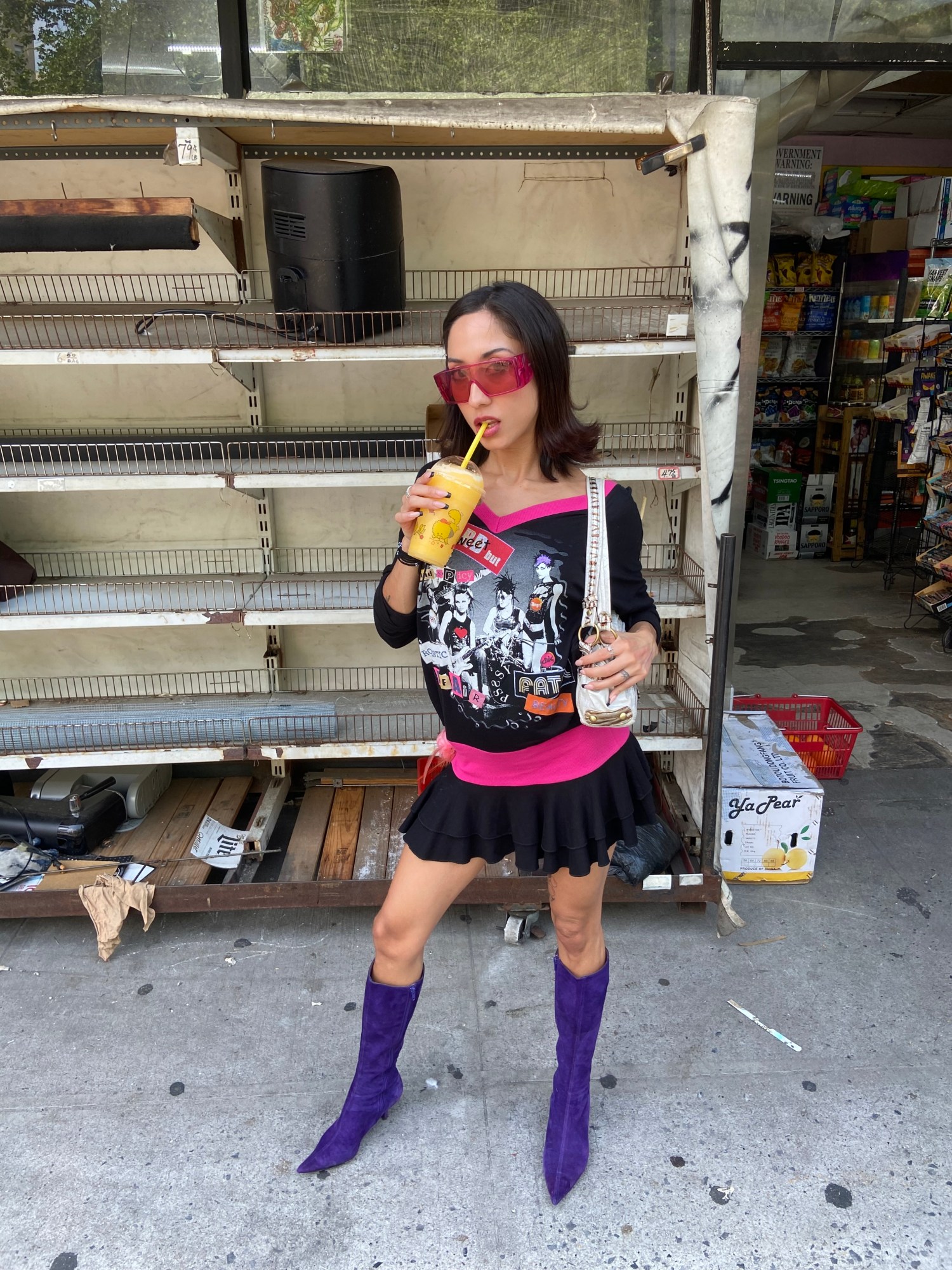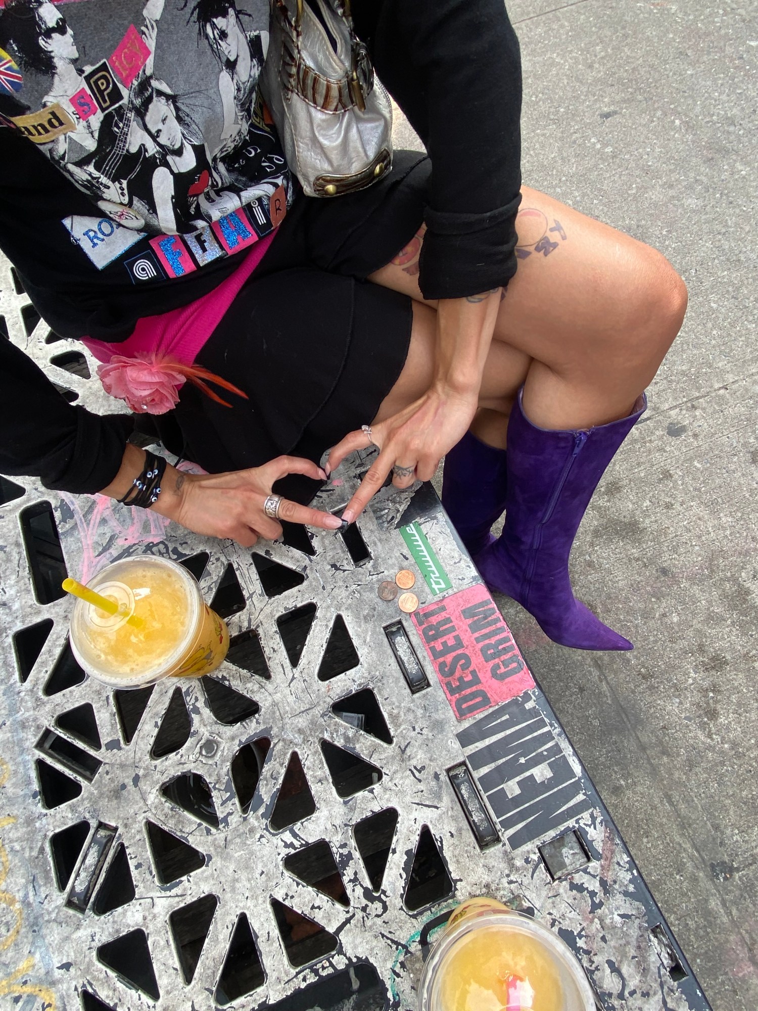 We got slushes from A&N Fruitstore—I ordered watermelon (no added sugar!) and she got honeydew—and found a nice wooden palet to sit on and chat about her new sophomore album Vanity and recently announced tour. Maybe it was the heat. Maybe it was the insulin spike from the slush. Maybe it was the bodega cat running over our feet. Or maybe it was just basking in the star’s warmth. Whatever it was, our slush date was a giddy, giggly affair—all about the dark side of beauty.