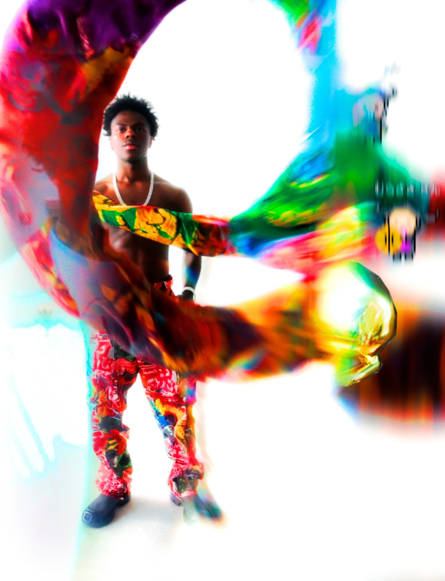 With Speed fully dressed (with his freshly trimmed hair) and on set, Korine begins uploading Speed into EDGLRD’s multimedia universe, the process akin to receiving a digital spray tan. A handheld mechanism with hundreds of tiny cameras is manoeuvred around Speed’s body, while a digital version of him starts populating the computer screen behind him.