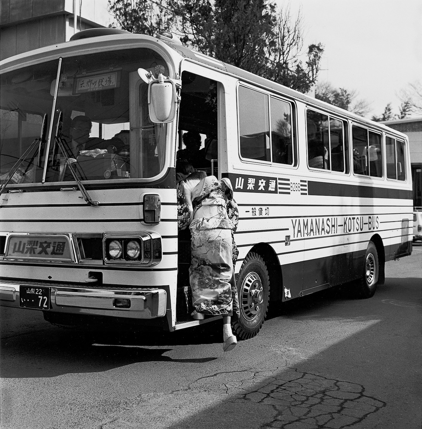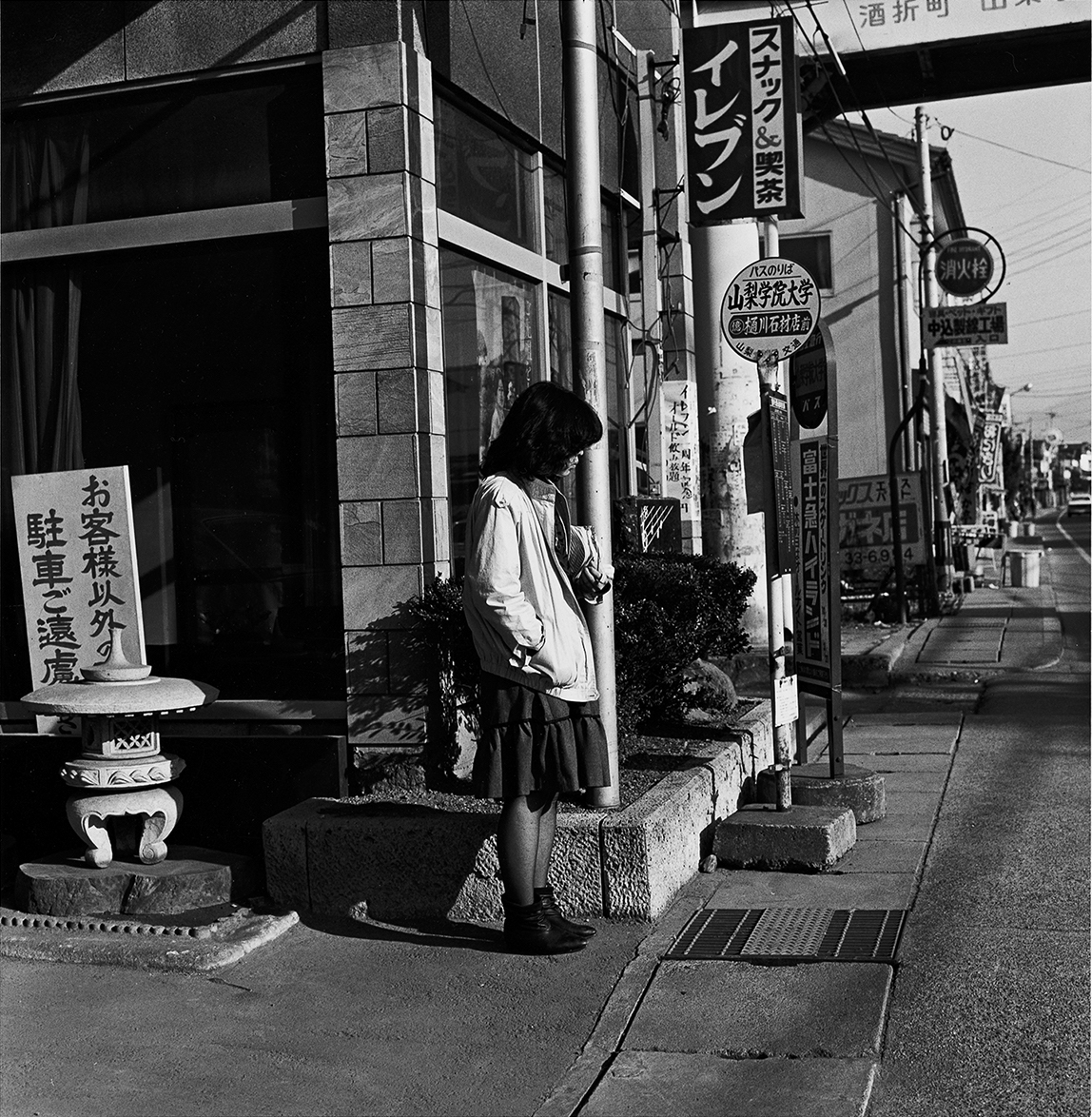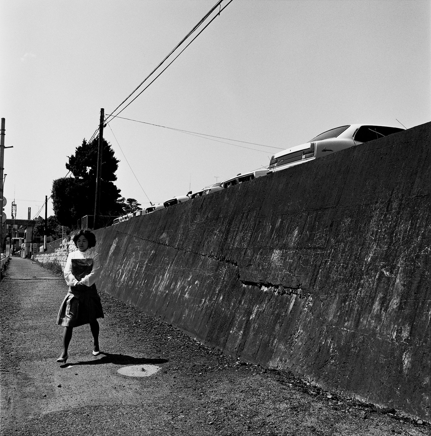 Despite Issei’s refusal to make any grand social or political statements (the 80s saw a giant bubble economy propel Japan to new heights of extravagance and excess), he was witnessing more evidence of modern living. Each frame uncovers its own dissonant harmonies and puzzling nuances, with the textures of western modernity and traditional culture not so much clashing as intersecting. A businessman in an oversized suit crosses a thicket of bamboo. A dainty schoolkid skips under colossal steel girders. A kimono-clad girl slurps a beer in hip urban style (she’s obviously a different kind of woman to those Issei saw in the countryside). Even in the small corners Issei inhabited, change was afoot.