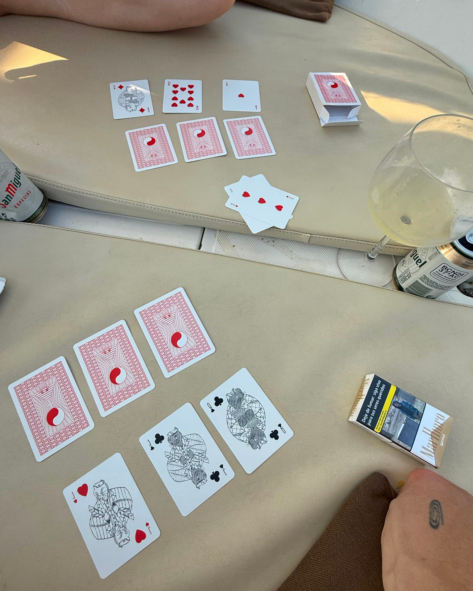 You get a choice: sail north, towards the tourists, or south, into paradise. Imagine if I said north. I snorkel, smoke, sip tiny cans of beer, and play cards. Another useful tip: learn at least one card game that isn’t Snap. I go with Shithead. (Google it—I got ChatGPT to write me a recap of the rules.)