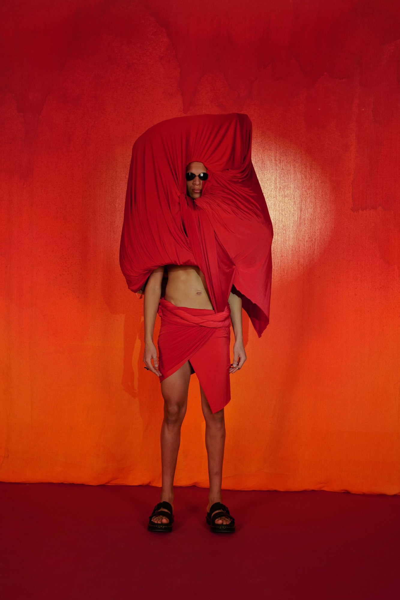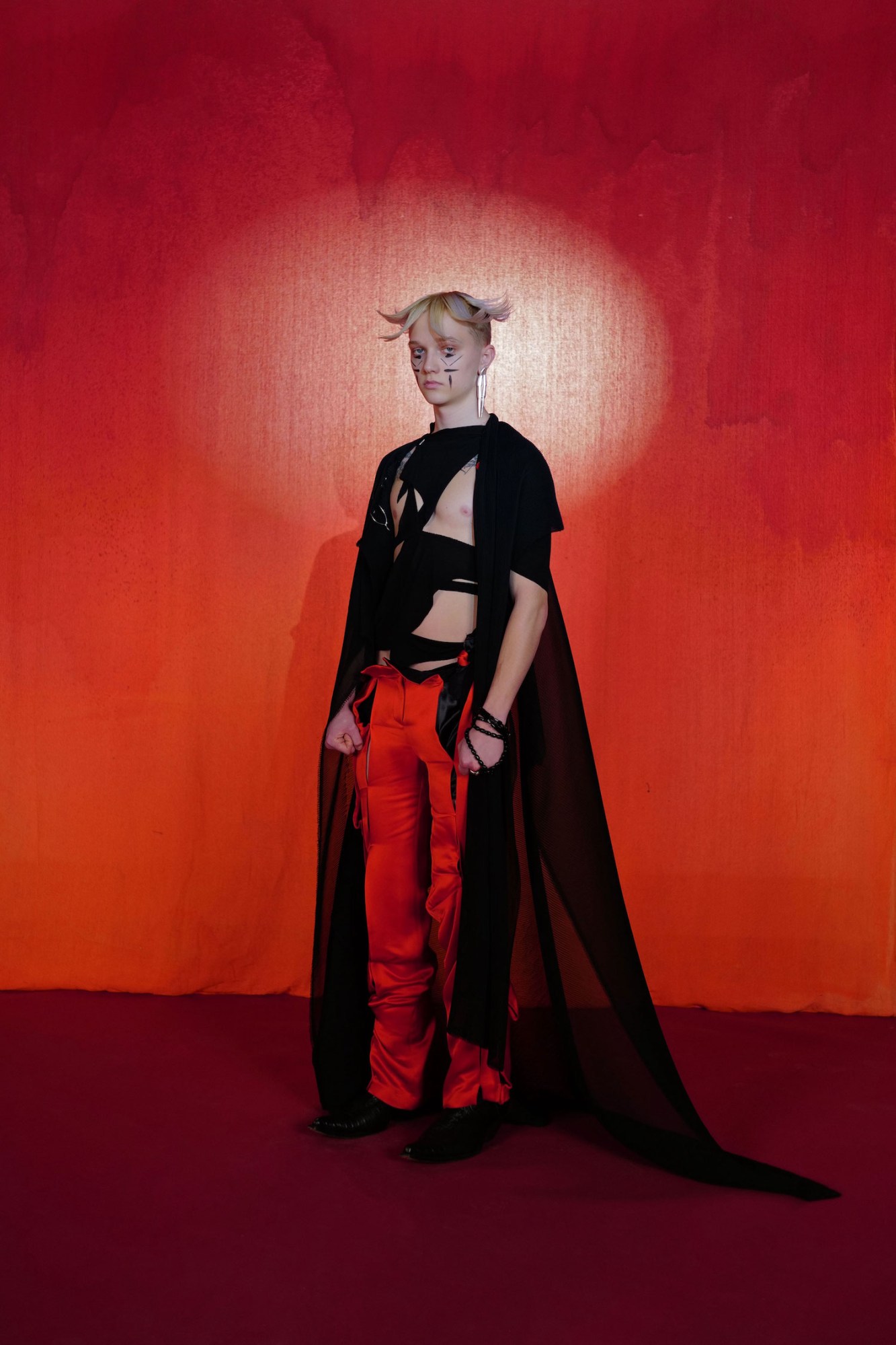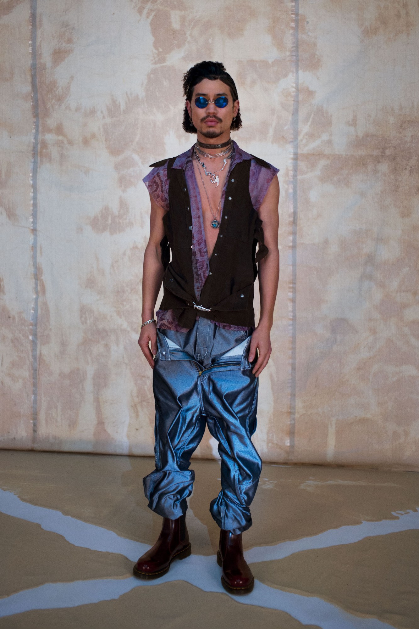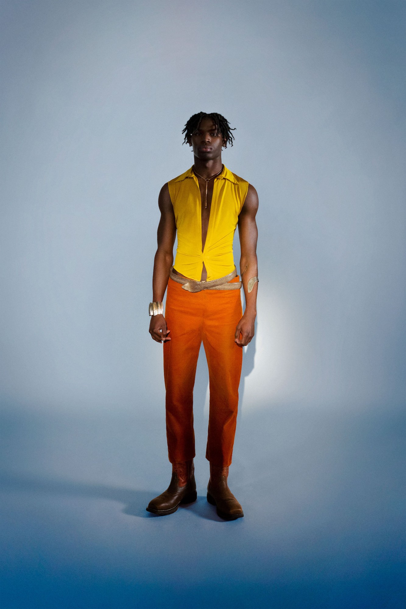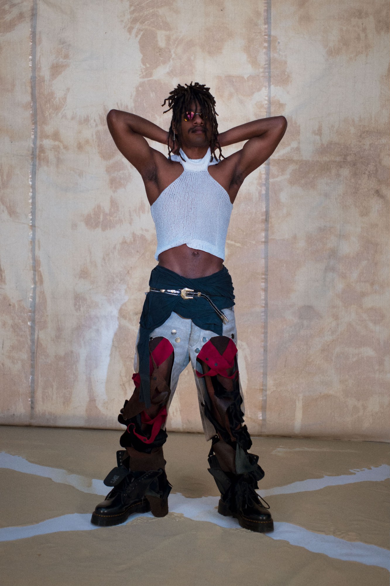 Hey! The collection on one level explores Caribbean mysticism and storytelling as a starting point and develops into a story that follows a Captain and her Crew on their ship ‘The Renegade’ as they travel through space-time, trying to stop a great evil from destroying the Sun City. The collection sitting within that story delves deeper into sensuality through draping in menswear brought to life through a mix of hand-crafting techniques. Loose hand-weaving mixed with cross-cultural and artisanal approaches to draping are used to bring this collection to life.