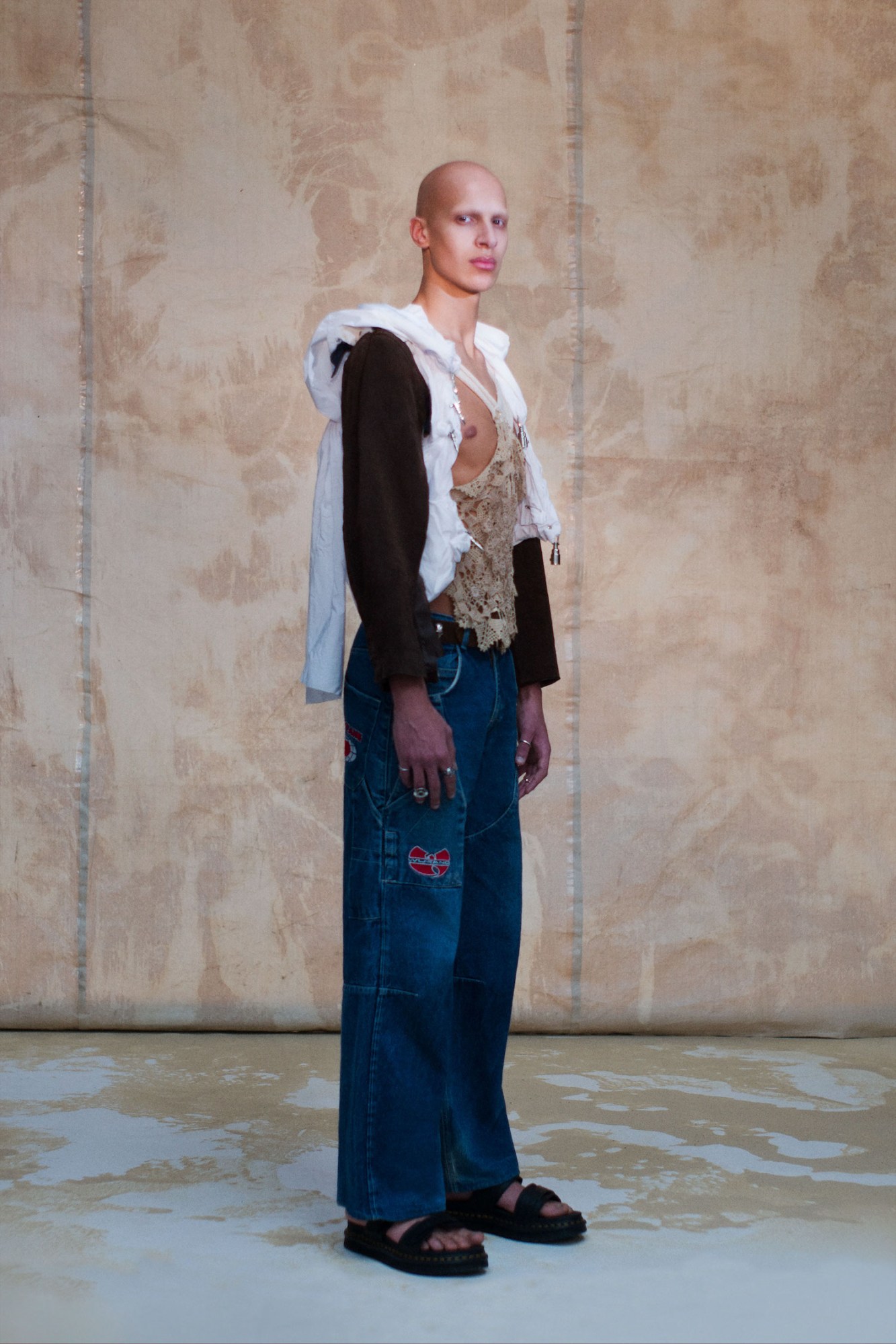 Through exploring Caribbean mythology, Jawara has toyed with the notions of ancient and modern masculinity, creating work that is at once both sculptural and grounded in the reconfiguration of archetypal garments, such as tailoring and denim. His AW21 is just a dozen looks — much of it upcycled, as a result of lockdown — but as Lulu Kennedy, Fashion East’s matriarch, points out: “New designers needn’t do loads of looks. Maybe the work is extra focused as we don’t have the usual distractions of a social life.” We caught up with Jawara to discover the intricate story behind his first official collection, the challenges of putting together a debut during lockdown, and the poetic world he’s building with his designs.