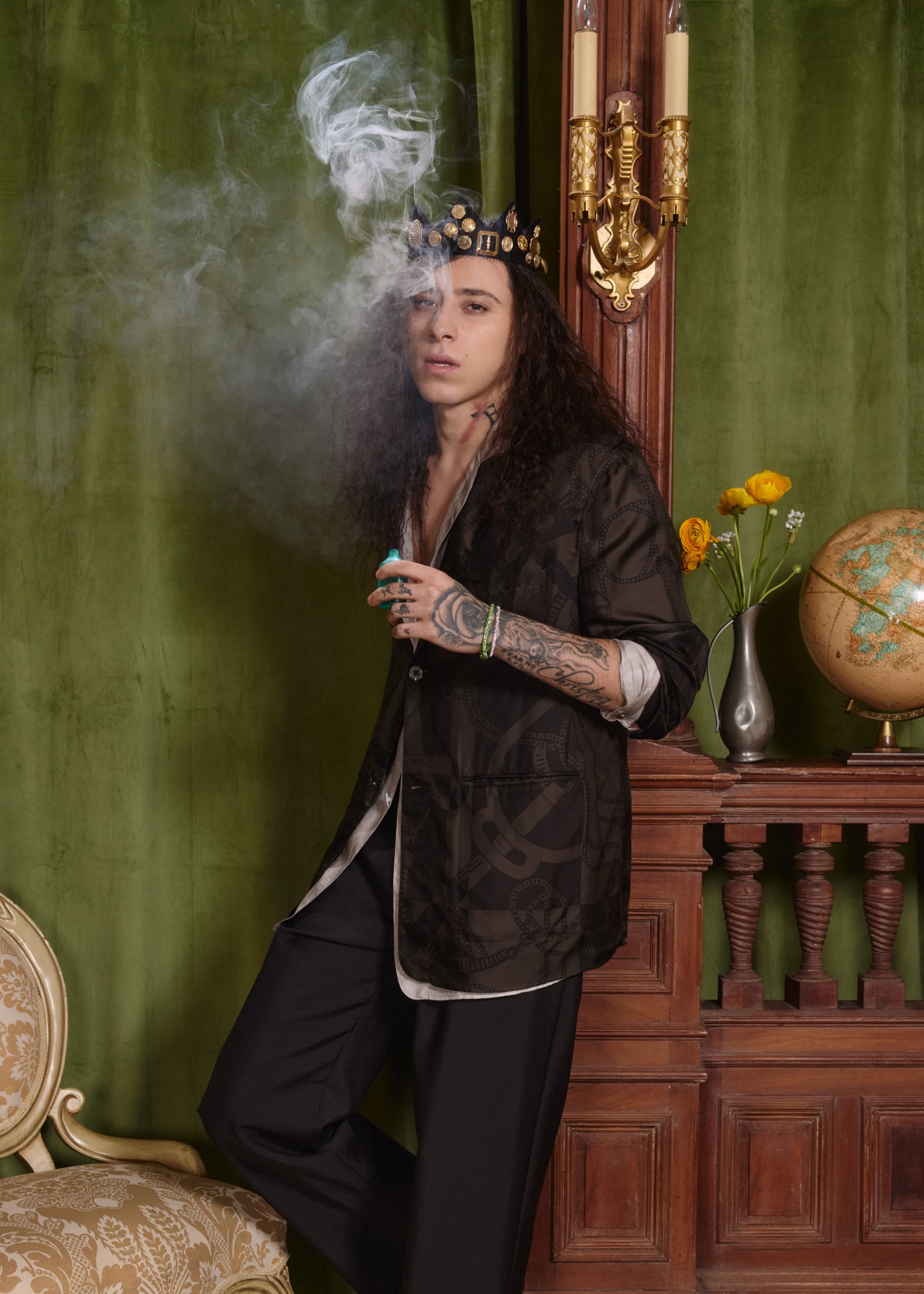 Guapo describes his younger self as a shy but attention-seeking individual. He isn’t phased by public recognition and enjoys it when he catches an onlooker trying to sneak an incognito photo of him. He always had a desire for a stage but was unsure where to find one. “I was never really that kid who knew who he wanted to be this or that,” he explains. “But I swear to God I knew I was going to become famous.” If Guapo did have a dream job growing up, it was to be Steve Irwin, the late Australian zookeeper and TV personality. He has a strong love for animals; his dog and two cats are tattooed on his right arm, accompanied by a feral wolf inked on his left (his favorite TV show of all time is Teen Wolf).