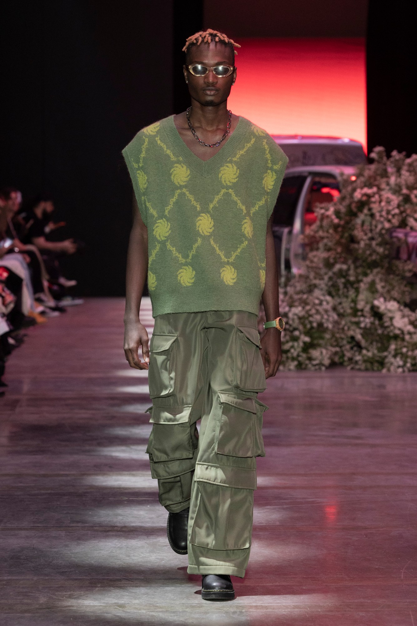 One of the first runway shows was Berhasm, the fashion, arts and music collective founded by Beso Turazashvili, who staged their AW23 collection “It Is Not My Dream” around a beat up, graffitied silver Mercedes with white flowers spilling out its doors. Amongst a series of tailored jackets and separates, the label known for mixing streetwear and 90s nostalgia with Eastern European aesthetics, debuted their first ever handbag – an oblong, edgy baguette with silver hardware – and colourful knits, each featuring the Georgian symbol for freedom.