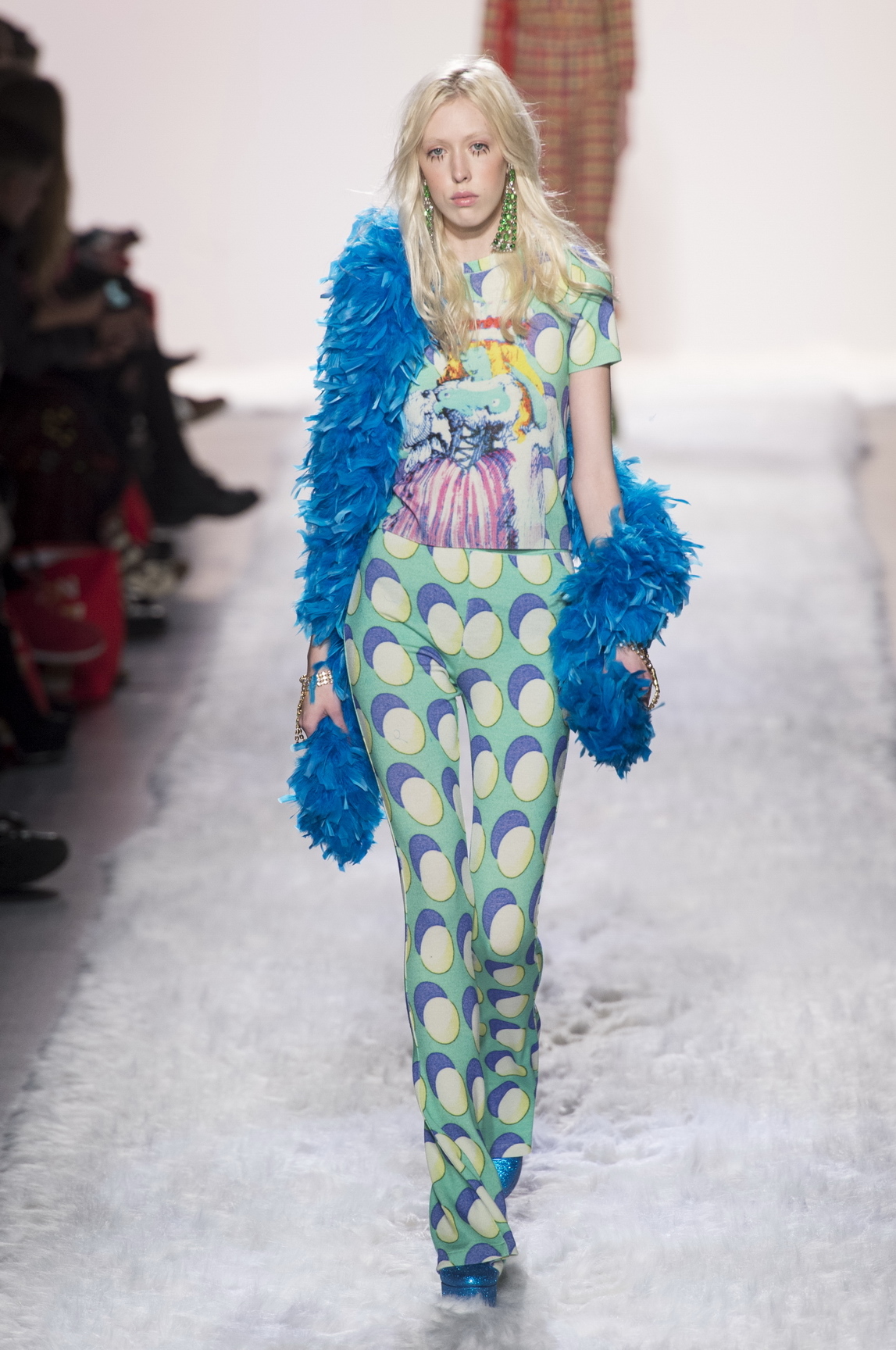 The designer treaded on familiar turf for fall/winter 17: namely, the 1960s and 70s. The eras’ straightforward silhouettes and shapes are the perfect canvases for Scott’s explosions of embellishment or cartoon graphic treatments. Last night, we saw crushed velvet flared trousers, striped shift dresses, motorcycle jackets, cocoon-like feather coats, suede patchwork pants. Scott represented the dramatic evolution of 60s style — the most transformative, turbulent decade in American history — from Mod to Marin county hippies.