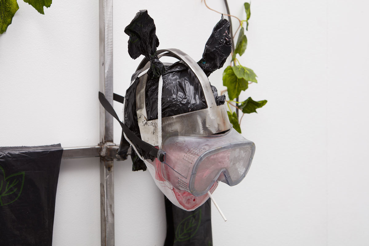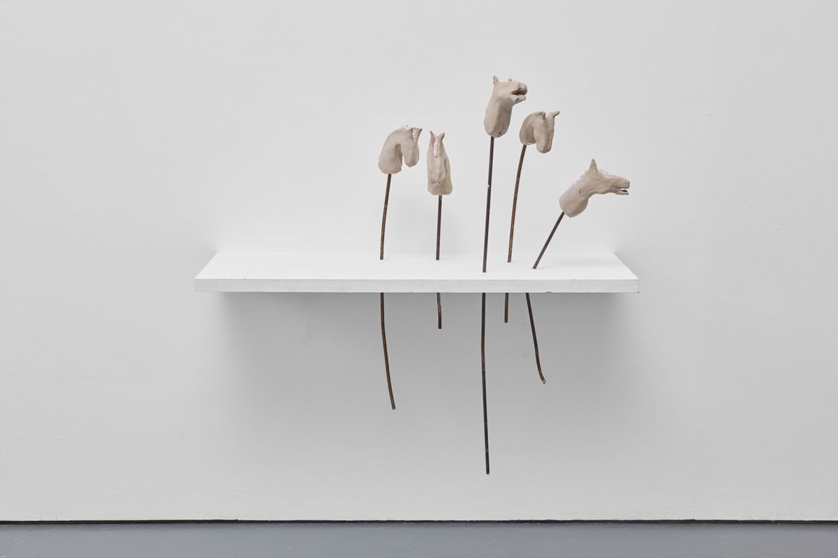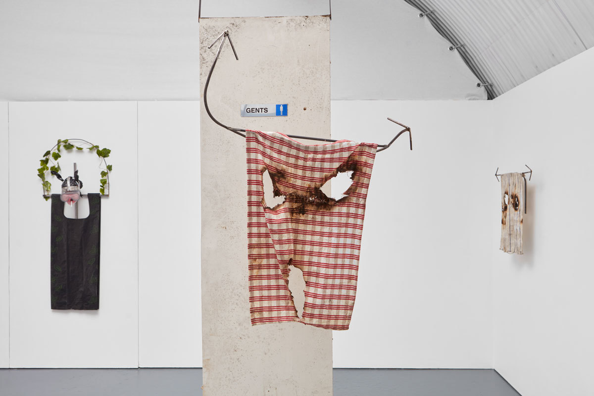 It can be read as an index to the works, in large part legibly assembled from equally legible low- and no- cost material: steel, cloth, clay. Barbed wire and plastic cherries gird Temps de Cerises I; plastic ivy the cruciform of Saint Batman, face of pink expanding foam; body of printed binliner. Temps de Cerises II rests on wood stilts and trolley wheels; a hot pink matte, flat, tall rectangle with bare branch that blossoms pink expanding foam (while a red flashing bike light bears signal or alarm). Colonel Shanks flat, tall, rectangular body rests on the A-frame of an aluminium mobility crutch and bent steel legs (shy or broken); its rear bearing bike chain and grosgrain ribbon; its front a white styrofoam staghead. Cavalry of sculpted clay horseheads rests on stems of bent steel mounted on a cheap shelf. On the walls, mounted burnt eyes or faces of dishcloth flags, hoisted by steel frames whose arrows point nowhere, in opposite directions: these named Domestic Terror, 1 2 and 3. Halos, horns or crowns of thorns; these spectres of good and evil of the secular, discredited Christianity of white, western nation-states. The hubris and detritus of Empire is what The Great Near draws from and builds on.