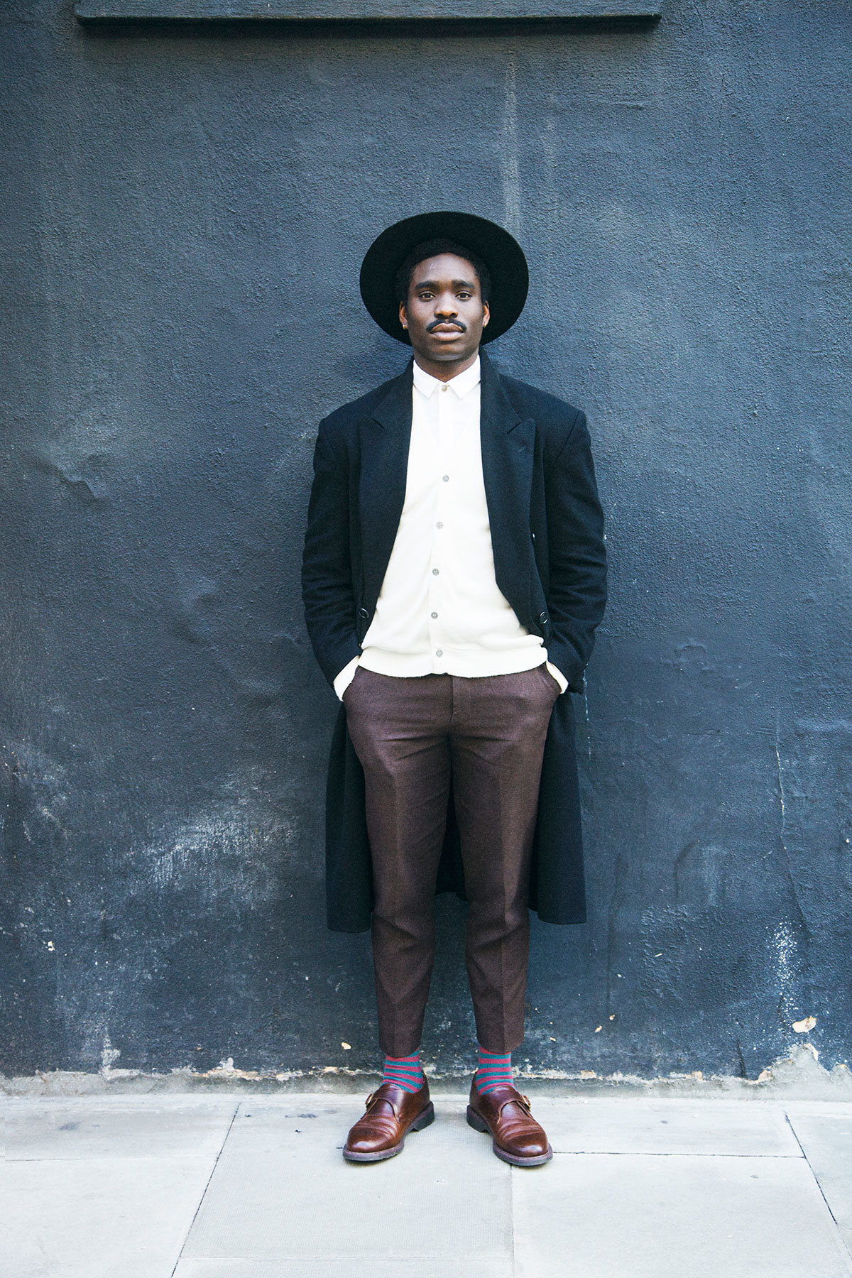 The hat’s by Euro Accessories, the guys who make budget fancy dress hats, got done on that one but it still looks decent. I found it in a vintage shop in Highgate. The shirt’s from Topman, but I customised the buttons myself, and my shoes are Dr Marten’s.