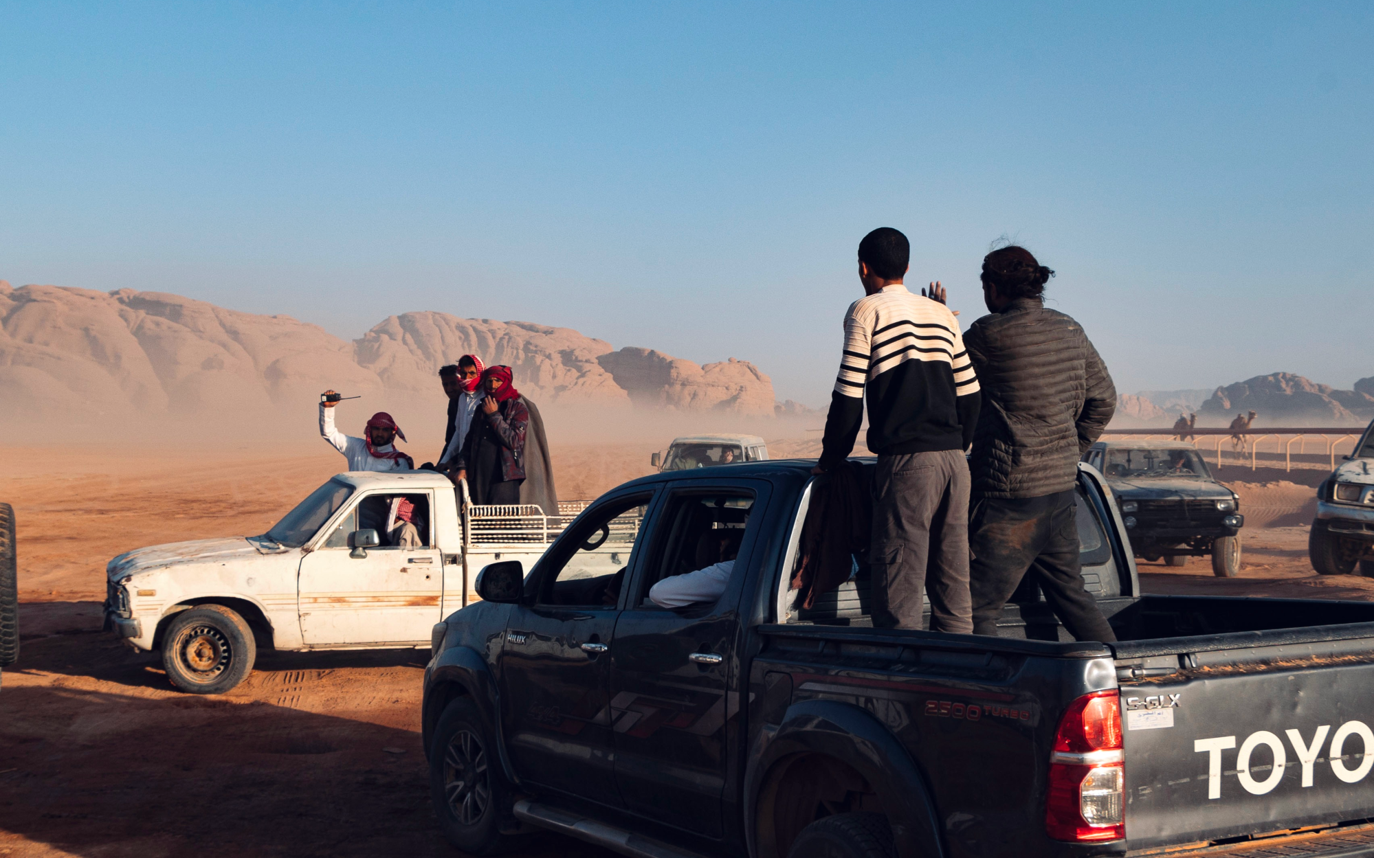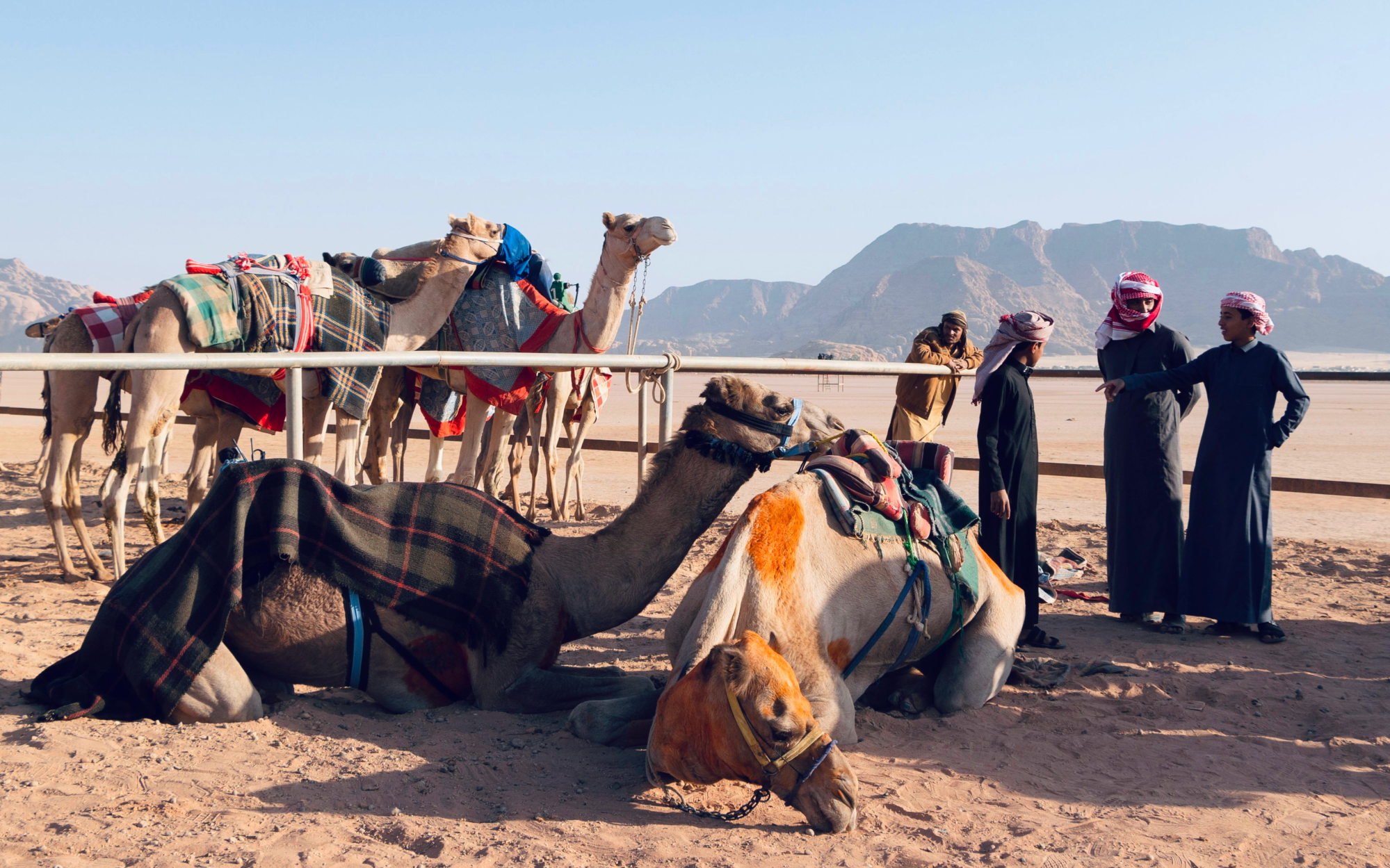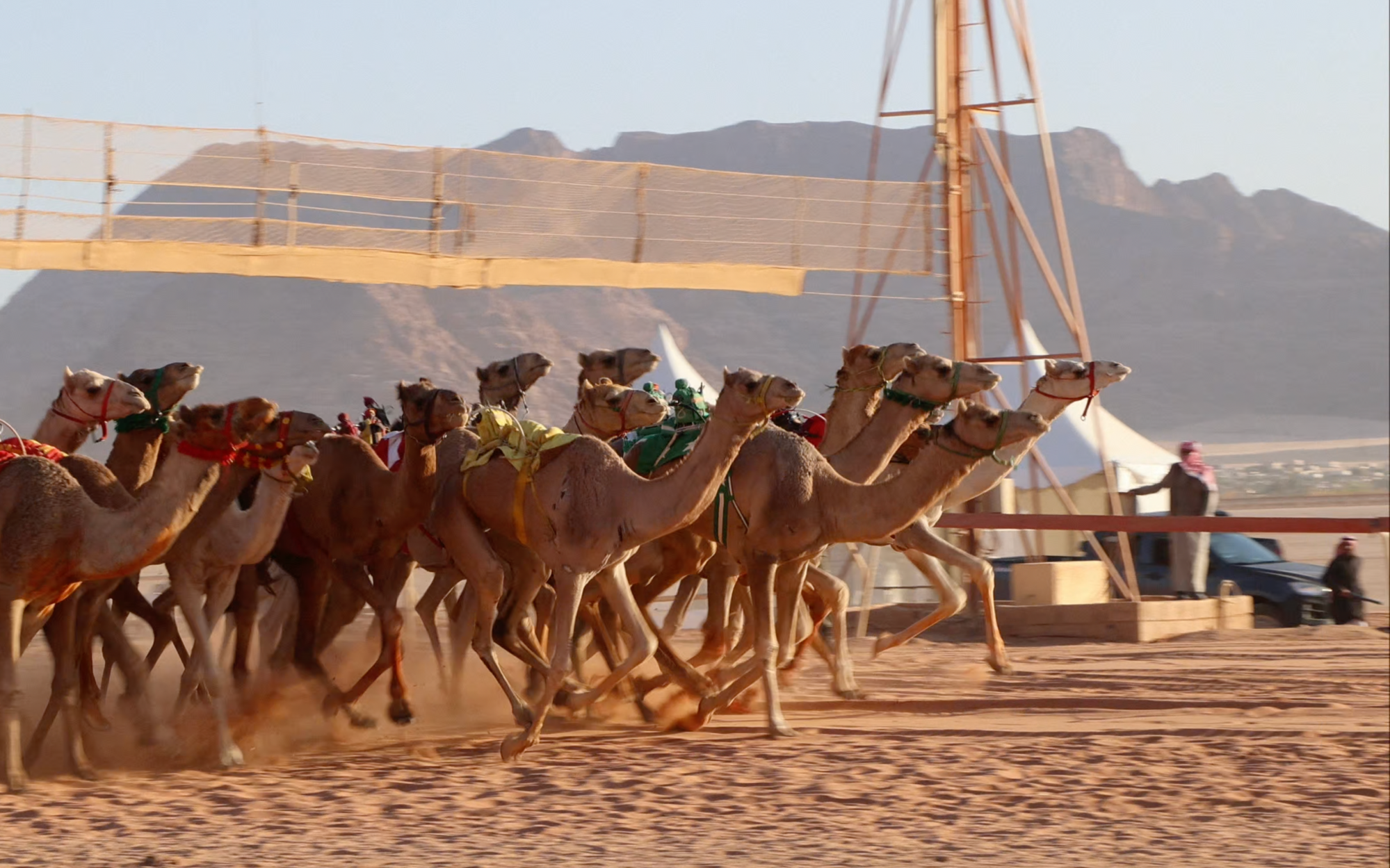 Each day begins at dawn. We sleep on the floor of our Bedouin tent and are woken at 6 a.m. by the gentle nudge of our elders’s walking stick. We drive straight to the track, following the camels for four kilometers across ten races. Some spectators watch from pickup truck beds, others from a large screen, and many gather on foot at the finish line.