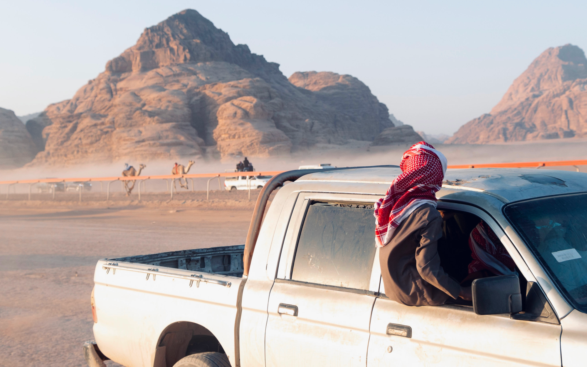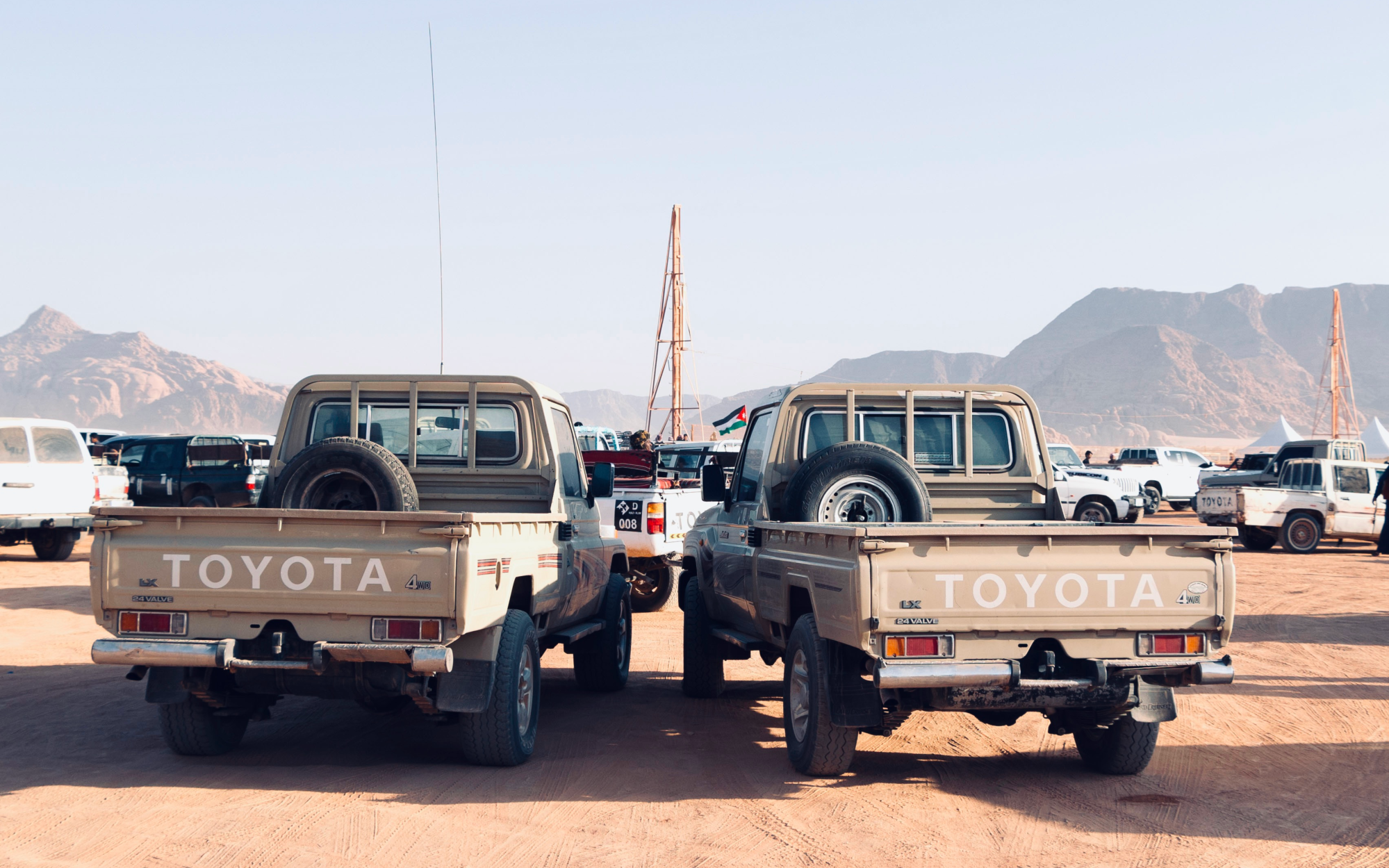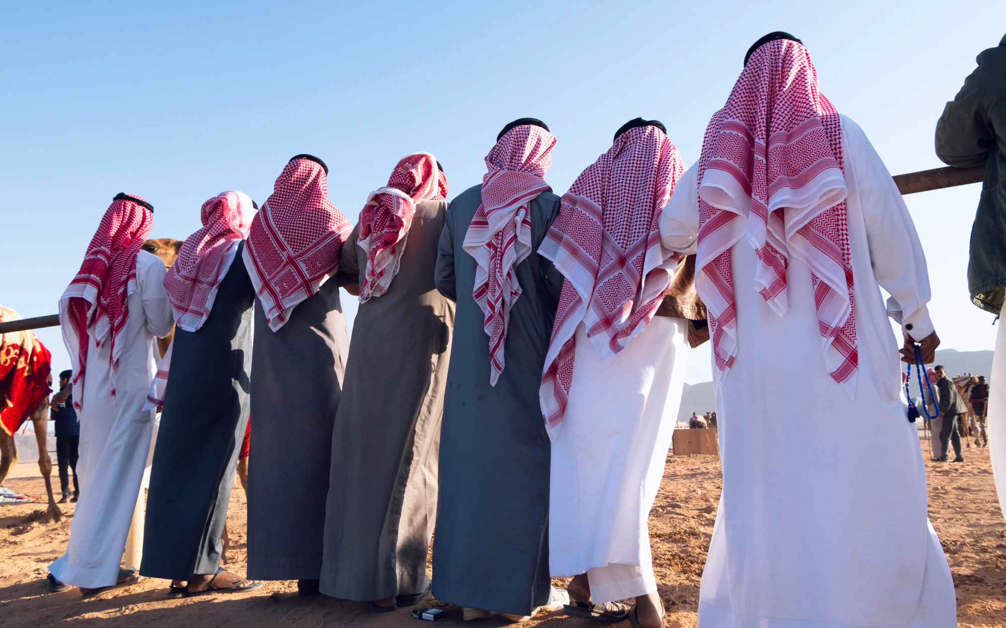 Each day begins at dawn. We sleep on the floor of our Bedouin tent and are woken at 6 a.m. by the gentle nudge of our elders’s walking stick. We drive straight to the track, following the camels for four kilometers across ten races. Some spectators watch from pickup truck beds, others from a large screen, and many gather on foot at the finish line.