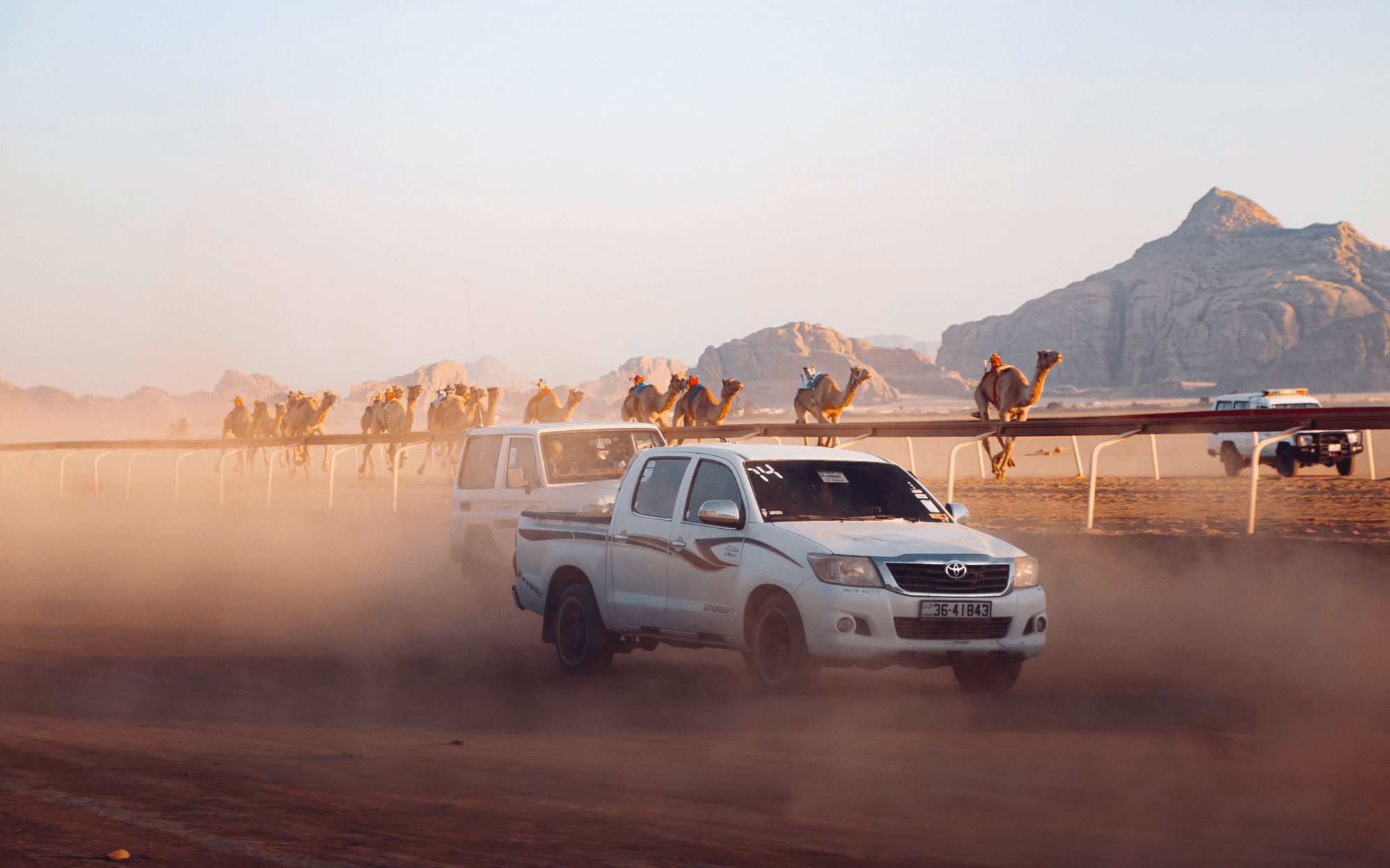 In the past, riders guided camels on horseback. Today, we follow them in our trucks, speaking through walkie-talkies while keeping our faces visible so the camels remain calm and focused. Before the race, we gently warm them up with the herd and ensure their family stays nearby, allowing them to return immediately to their dam and young afterwards.