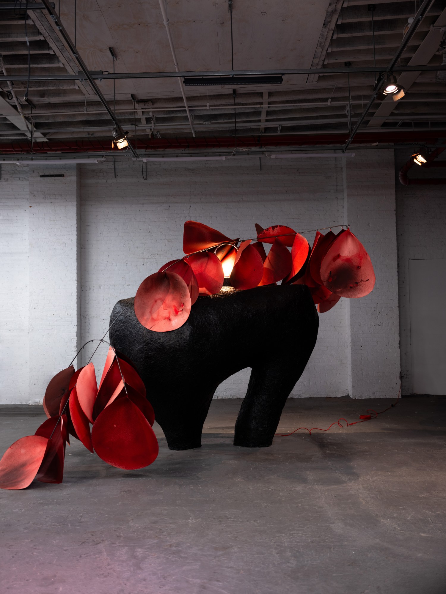 As part of her residency at the Brooklyn-based studio, Karina recently debuted her largest piece yet, “A Warm Embrace, Obsidian Incarnate, 2023”. This lamp-like sculpture, on display until 17 December, was inspired by the artist’s mother and Great Aunt, who have both passed away. Standing in between the curved body of the sculpture sparks warmth and comfort, the same feeling of being entangled in a hug, with your head resting on someone else’s chest.