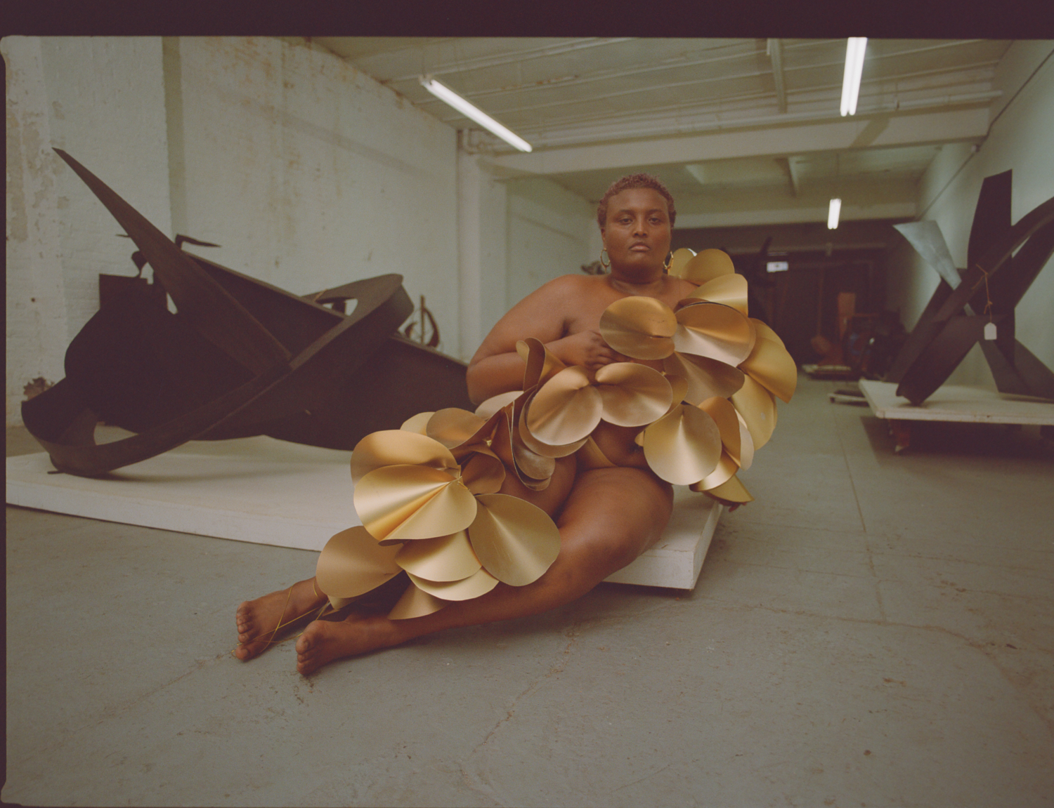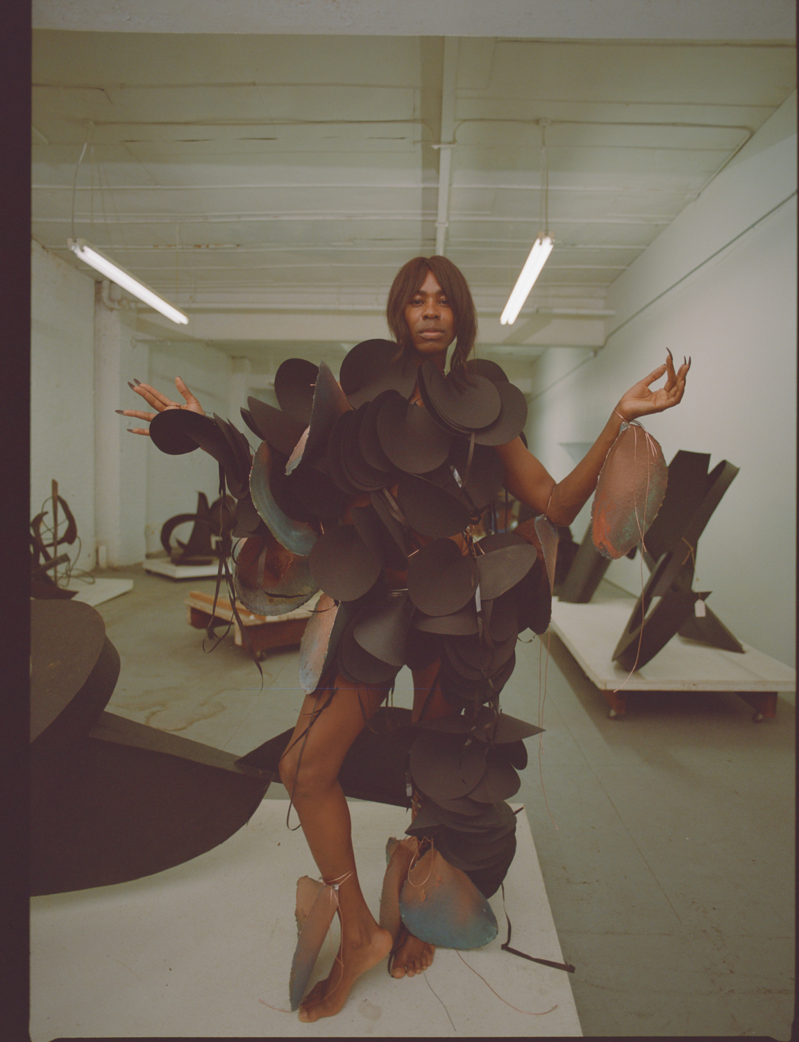 In addition to that first shoot, Karina’s recent independent exhibition Adorned Metallica at FiveMyles Gallery was pivotal in her practice. “It was a really beautiful take on just looking at ore and where it comes from, the natural resource, but also the power behind it,” she explains. “Because my work represents Black femmes, I really wanted to look at bringing those materials back to adorn individuals who, in my mind, reflect the brilliance of them and the natural place of where they belong.”
