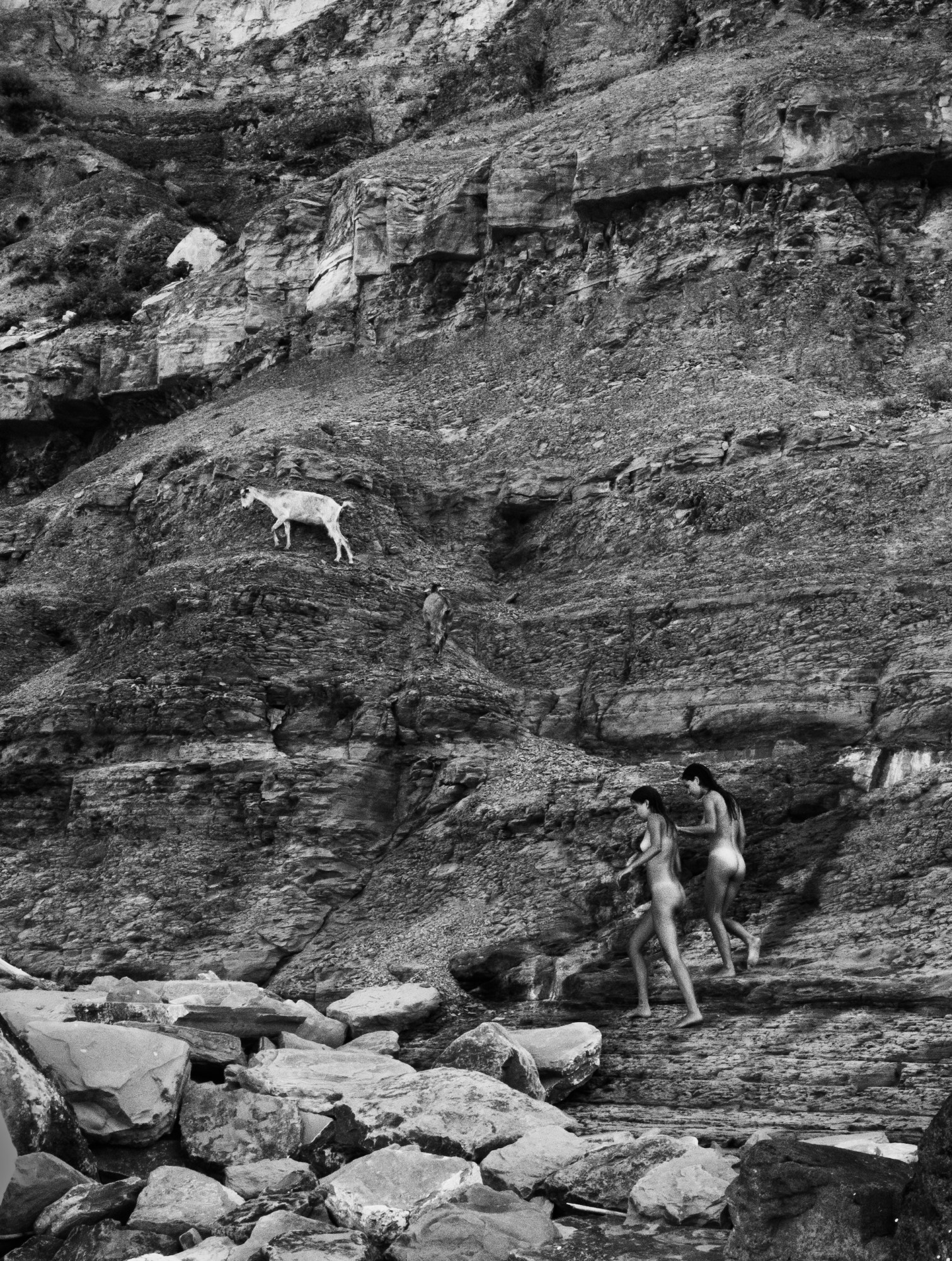 The adventurous pair are immortalised in the book in a spontaneous black and white photograph: following a goat up a rocky bay that’s only accessible by boat or by swimming. “No humans go there,” she says.