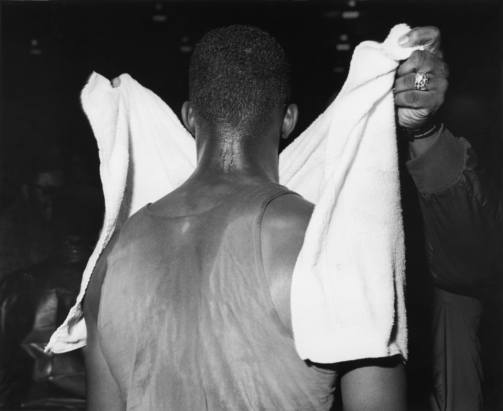 Touch, or a lack thereof, is the exhibition’s central motif, as wandering hands reveal a series of close interactions between friends, lovers or those somewhere in between. Ken and Eva lingered in the before and after, uncovering vulnerability in the moments prior and following a certain ceremony — like two girls dressing up for a high school dance — rather than the customs themselves. In one particularly compelling photo from the historic Gleason’s Gym, famous for hosting boxing legends like Muhammad Ali and Mike Tyson, an unidentifiable figure helps a boxer towel off, his sweaty posterior turned toward the camera. The darkened background contrasts a bright white towel, which as Brian aptly notes, resembles an angel’s wings in its billowing shape. God, in this instance, wears a glitzy diamond and gold ring.