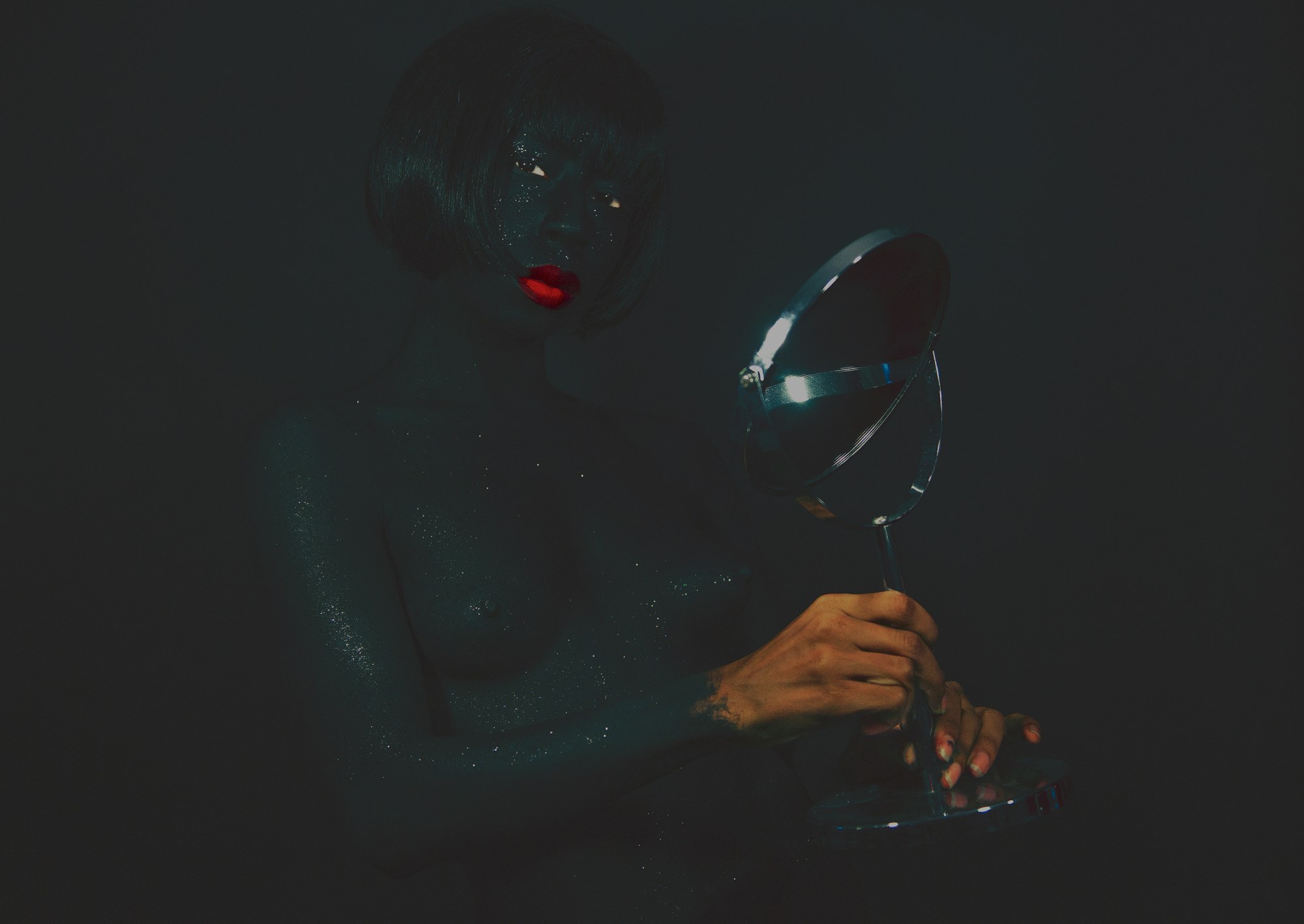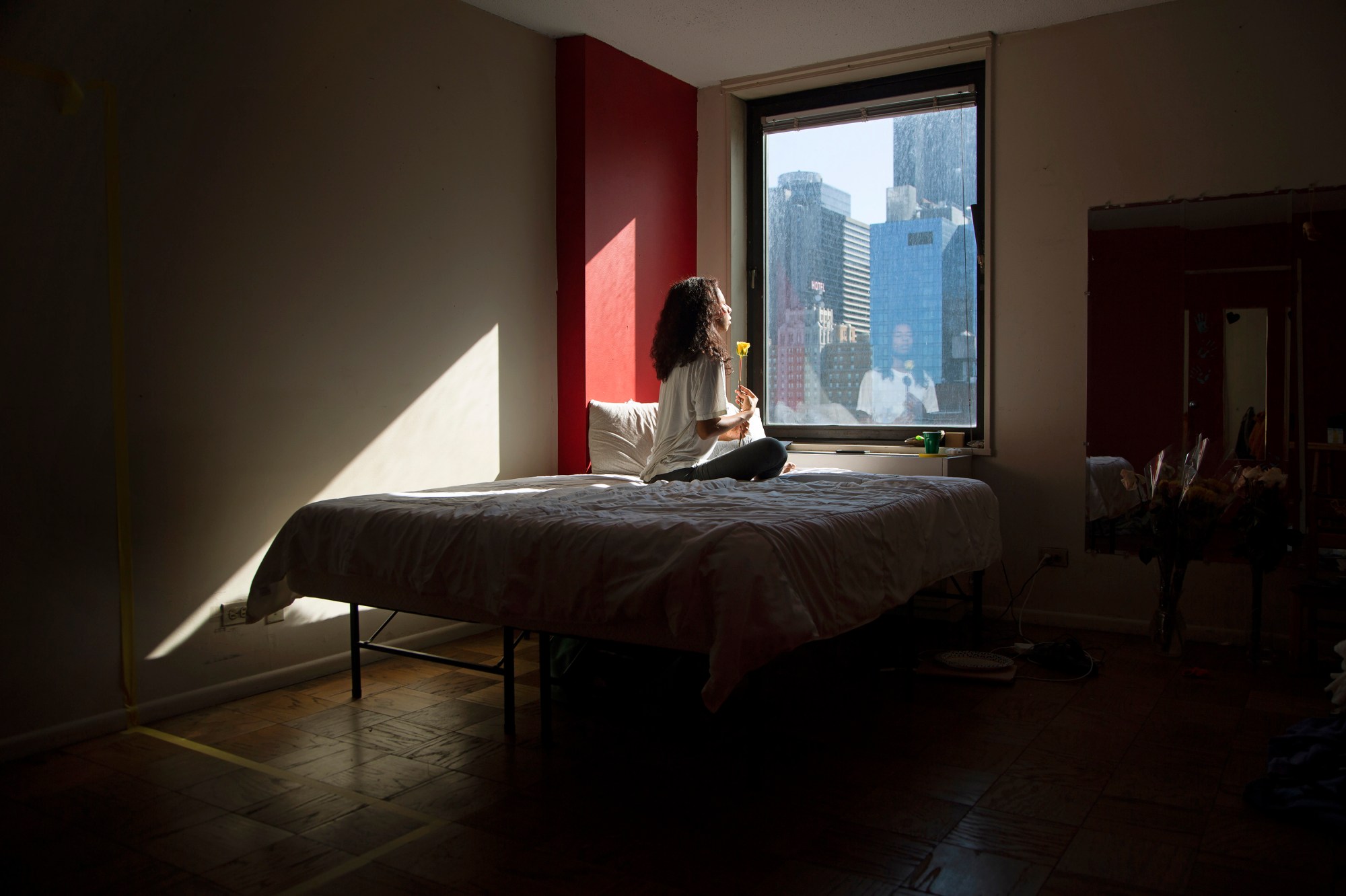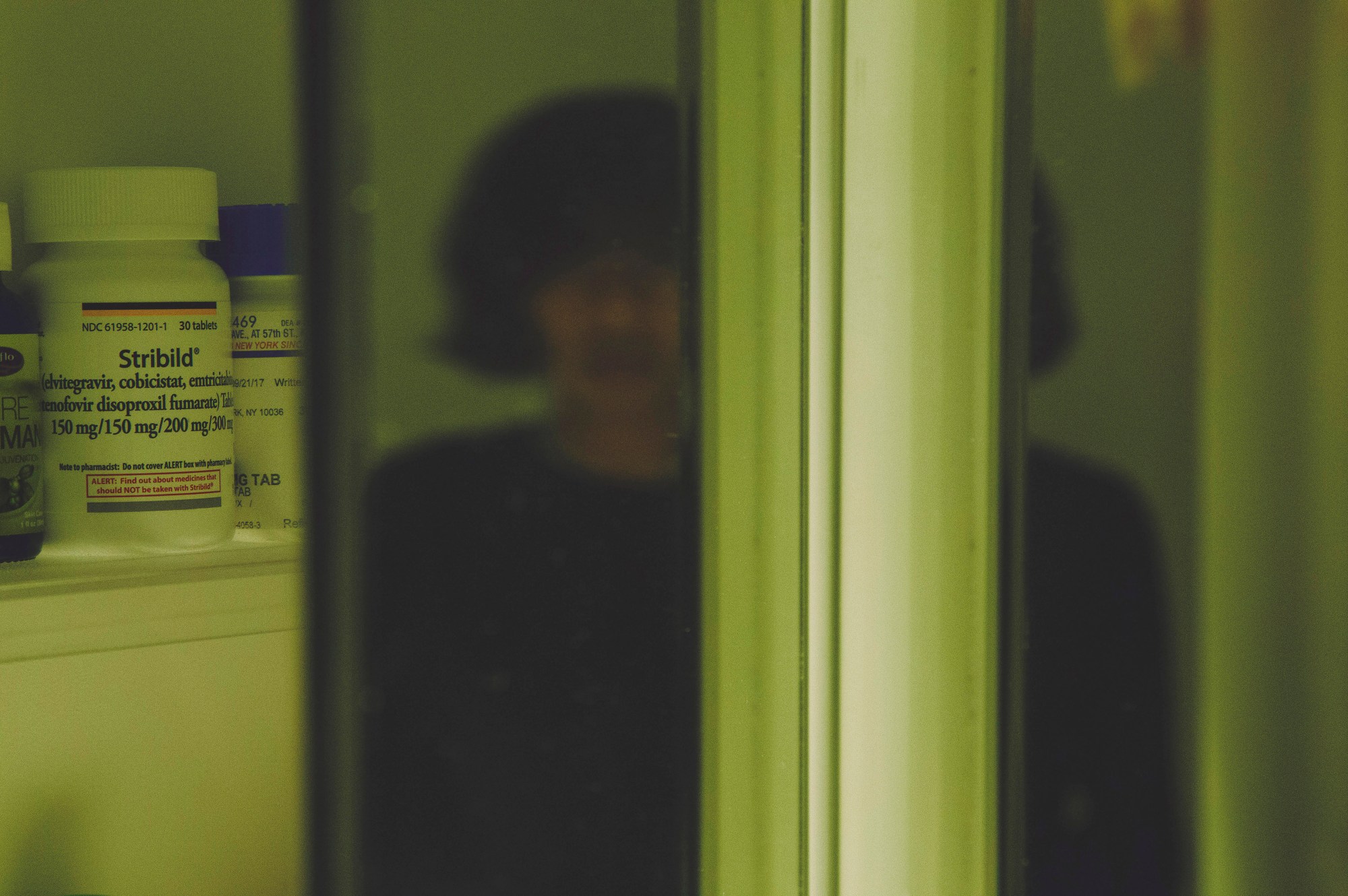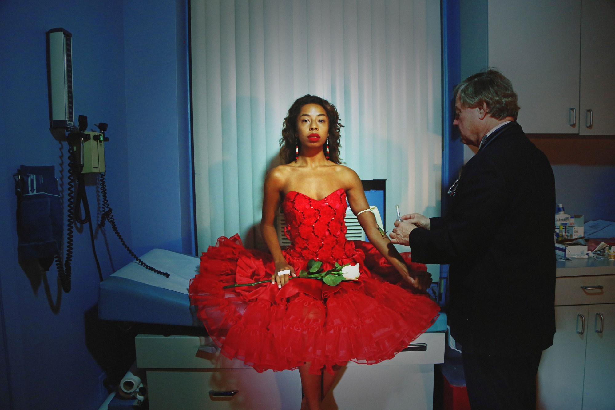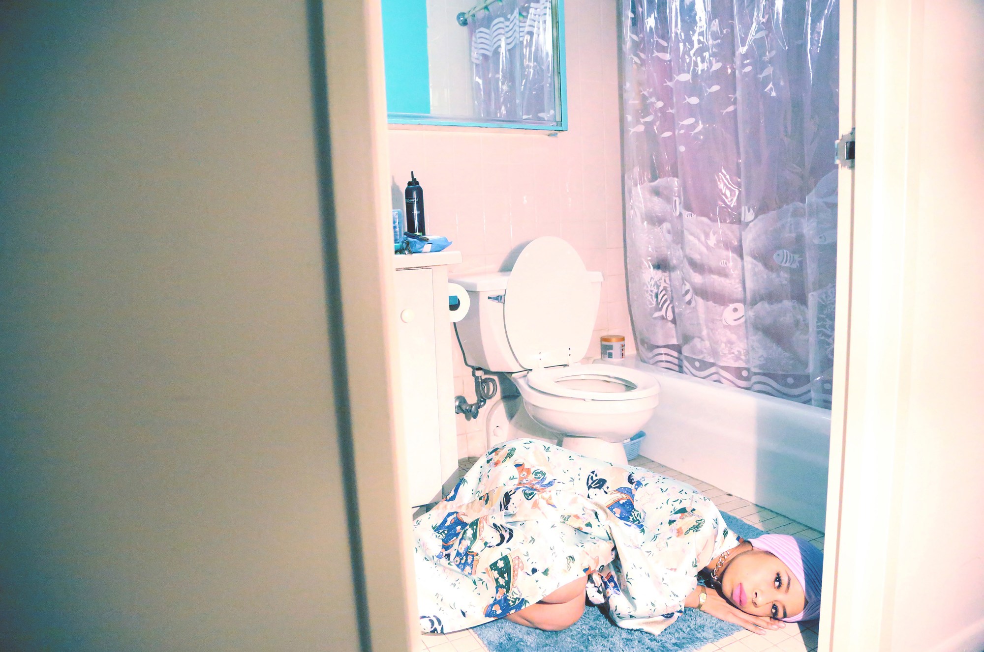 And yet, Kia has also mastered taking what has become ordinary in her life and giving it a stage. In one almost theatrical self-portrait, she’s sitting up on an examination table in a bright red prom dress (hers, which she distinctly remembers buying in high school), her doctor since age four taking her blood. Kia says she felt compelled to share something that had become so routine for those living with HIV, and combine it with the excitement she felt when she thrifted her prom dress all those years ago. Another photo spotlights Kia in a pink hue, making attractive and bright the moments where she experienced intense morning sickness, a side effect from her medication, on the floor of her bathroom.