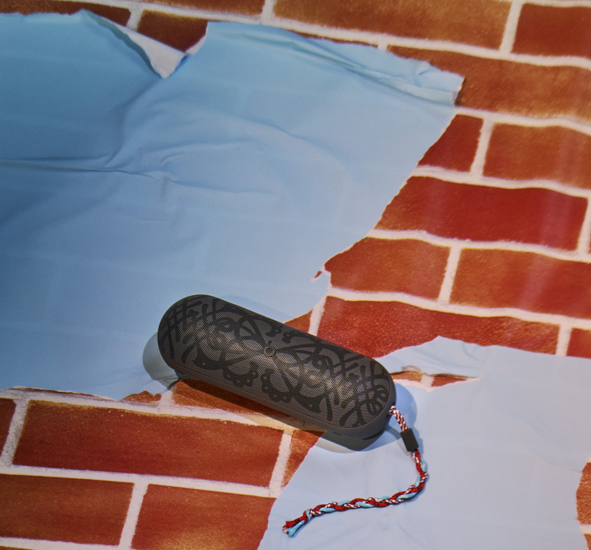 The result: a matte green Pill, its perforated grille layered with an intricate, abstract pattern that plays in shadow and light, the Beats “b” tucked neatly at its center. A braided cord in bright teal and orange twists from its side, adding a hit of handmade tactility against the clean industrial form. On the reverse, “KIKO KOSTADINOV” is embossed in bold capitals. It’s equal parts sound system and design object, meant to live comfortably on a desk, in a living room, or packed into a bag for a late-night gathering.