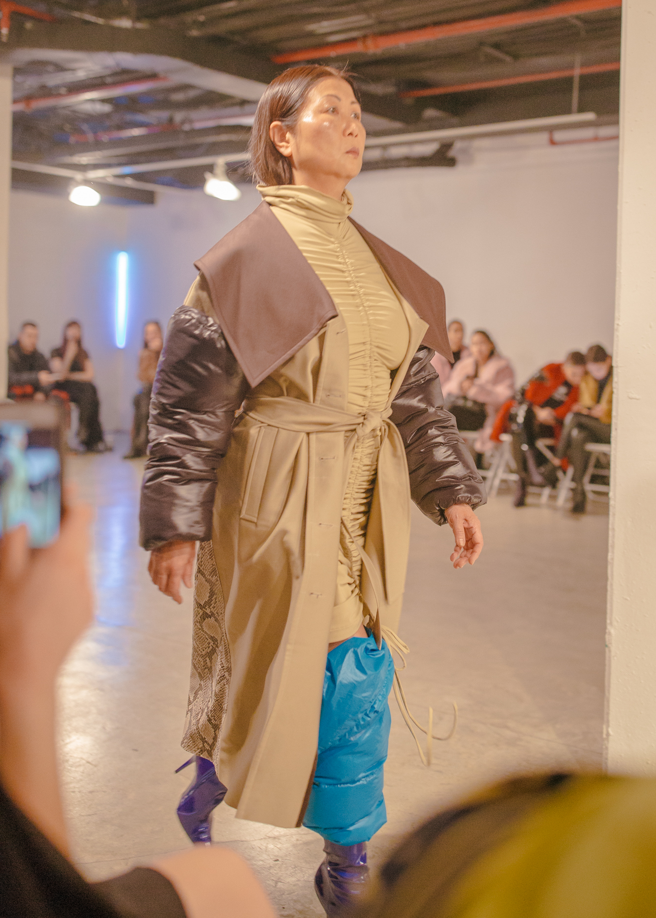 The “KS girls” represented here were all one of a kind, and they each brought a new edge to the image of Asian womanhood. Jane from Chinatown’s New Top jewelry traded in bling for a fur and puffer hibiscus-print coat (one of Shui’s personal favorites). Fiffany Luu and her mom Lily sported the collection’s spotlight colors, bold cerulean and sparkling navy — part clubwear, part Winter Olympics. “I also didn’t want to cast just via agencies and was looking for interesting girls with a story,” says Shui. “One of the models is an artist and told me she moved to NY with $5 in her pocket a few years ago and has now stayed and been able to pursue her art. We casted models of mixed Asian backgrounds, Indian, East Asian, etcetera.”