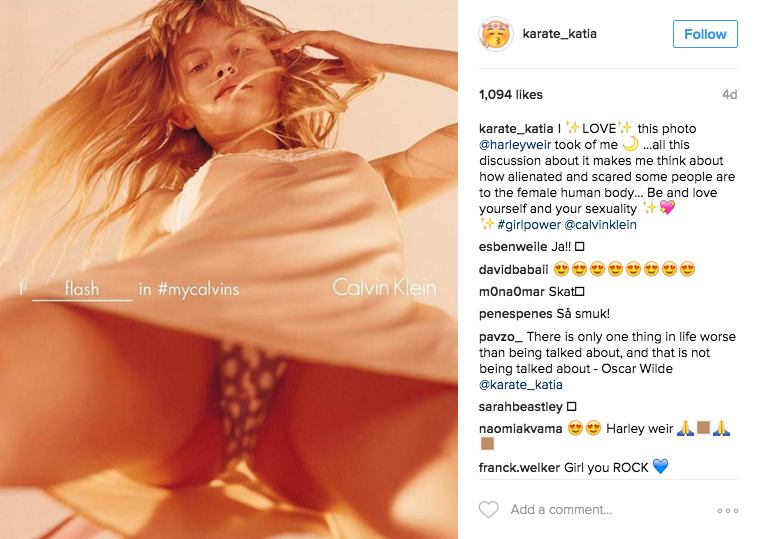 “I LOVE this photo @harleyweir took of me,” she wrote in a caption on Sunday. ” …all this discussion about it makes me think about how alienated and scared some people are to the female human body… Be and love yourself and your sexuality #girlpower @calvinklein”